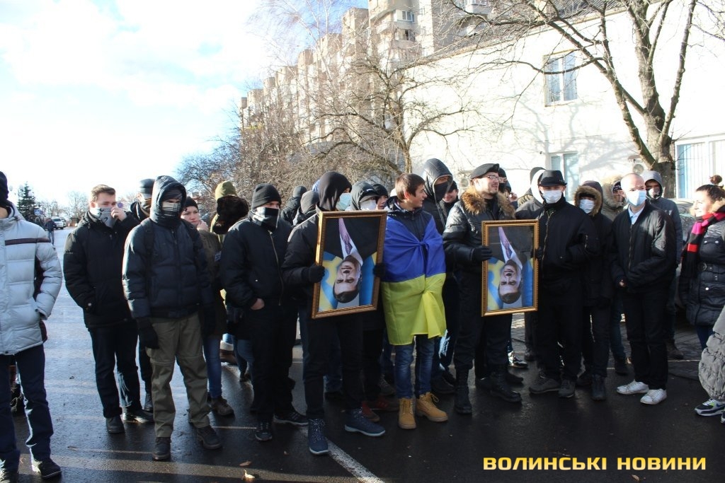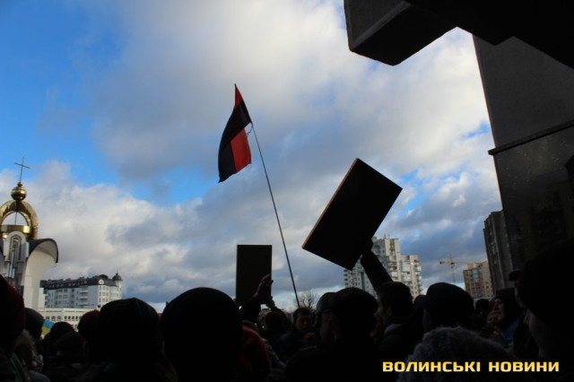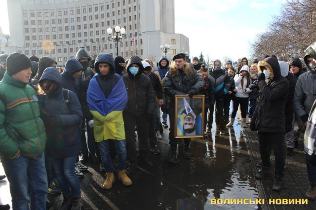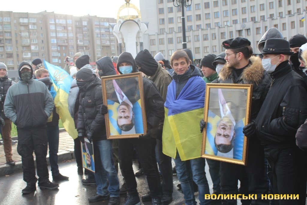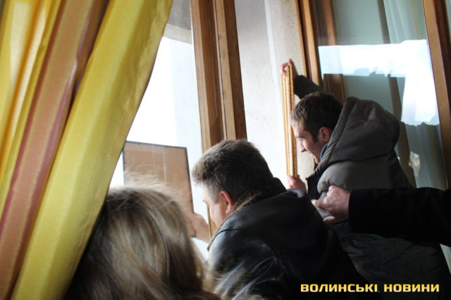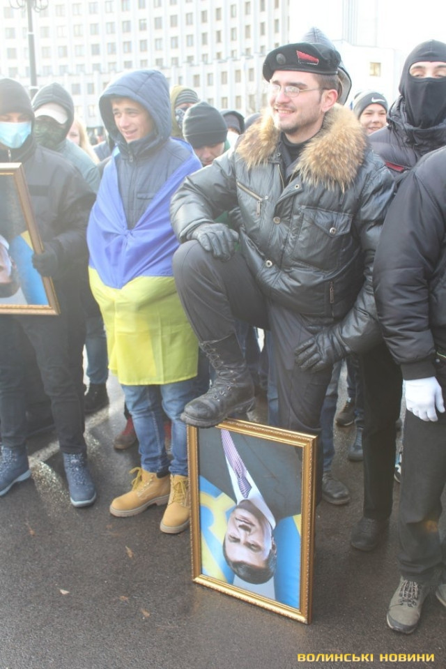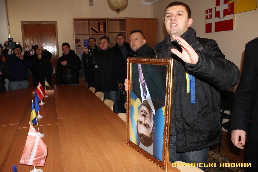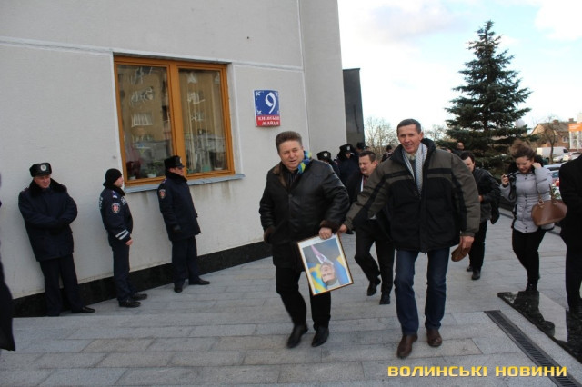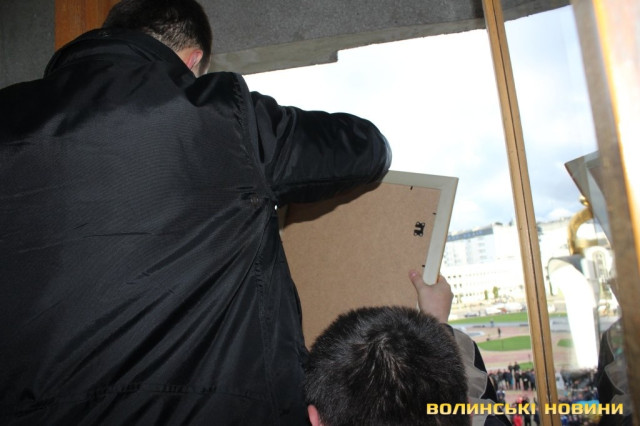 Під час мітингу, що відбувся 2 грудня, активісти луцького Євромайдану зняли портрети Януковича у приймальні голови облдержадміністрації, кабінеті голови Волиньради та прес-центрі облдержадміністрації.
