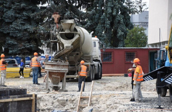 У Луцьку на Театральному майдані триває будівництво сухого фонтану на місці, де раніше було «корито». Наразі вже залили основу амфітеатру та провели комунікації