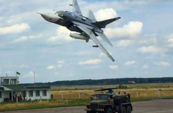 Фронтовий розвідник СУ-24МР пройшов на високій швидкості та гранично малій висоті над луцьким військовим аеродромом. Відстань до землі становила всього декілька метрів.