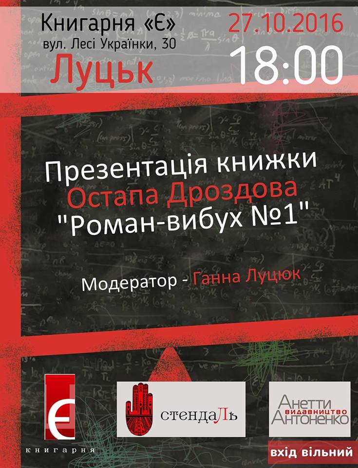 Презентація «Роману-вибуху №1» Остапа Дроздова відбудеться у Луцьку. Зустріч із автором та презентація книги відбудеться у четвер, 27 жовтня, о 18.00 у Книгарні «Є».