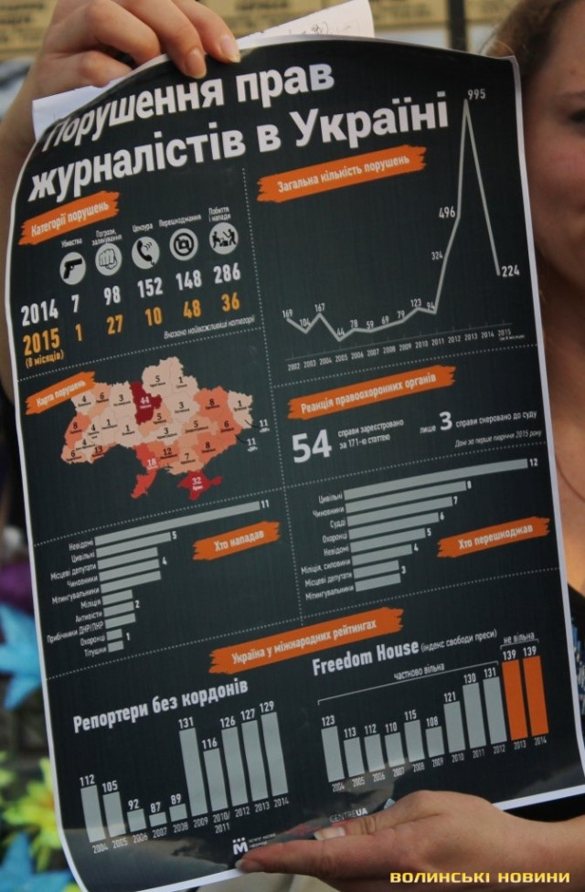 Інститут масової інформації постійно здійснює моніторинг інформації у медіапросторі Волині та офіційно зареєстрував чотири факти порушень прав журналістів. До прикладу, журналісту видання «Хроніки Любарта» Ірині Качан не дозволити вести фотозйомку та висвітлювати концерт пам’яті Андрія Кузьменка, у Нововолинську журналісту не дозволили потрапити на прес-конференцію Міністра палива та енергетики, у 2014 році під час представлення голови ОДА Олександра Башкаленка декількох журналістів не допустили до висвітлення цієї події.