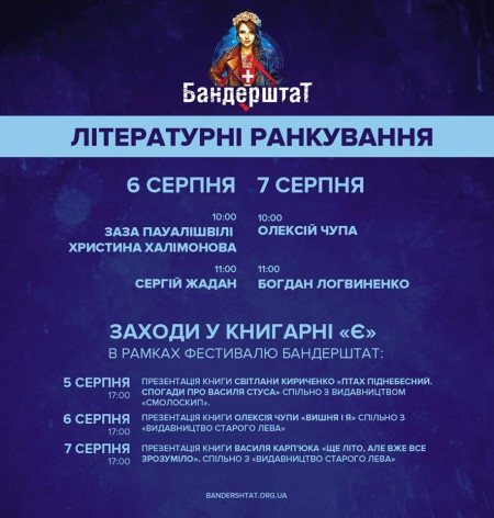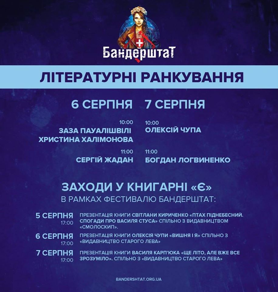 На «Бандерштаті», окрім насиченої музичної програми та зустрічей із громадськими діячами, будуть літературні заходи з культовими авторами сучасності.