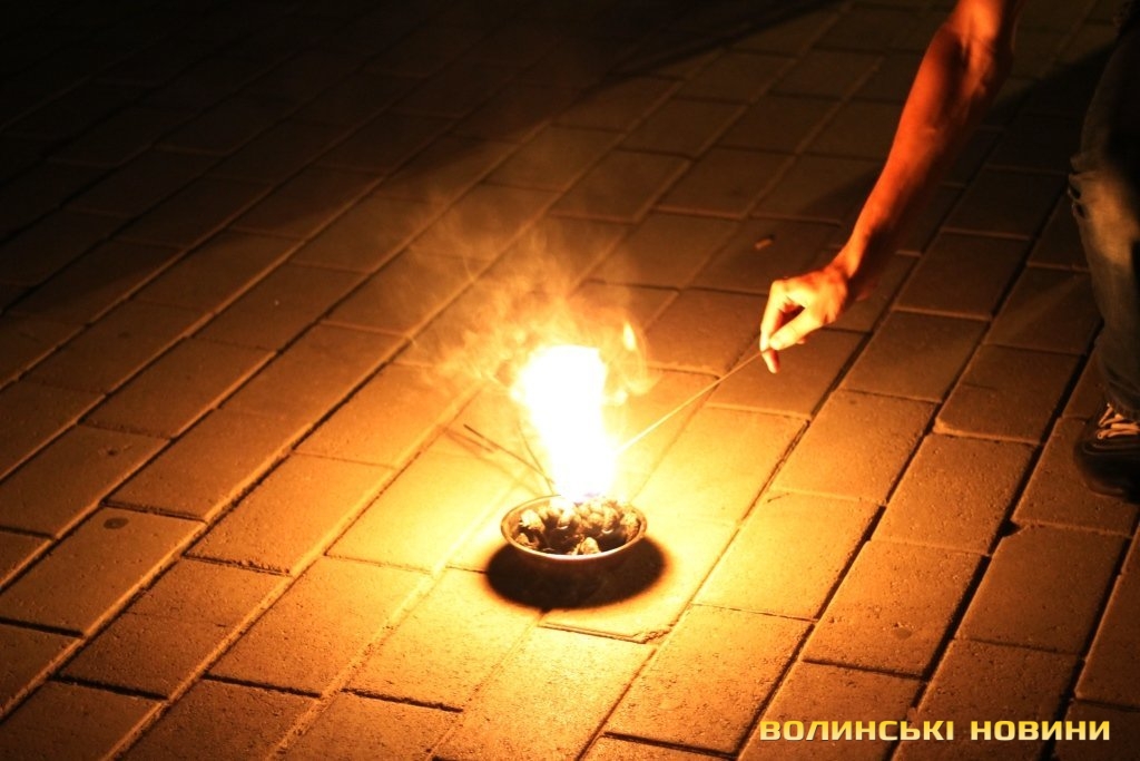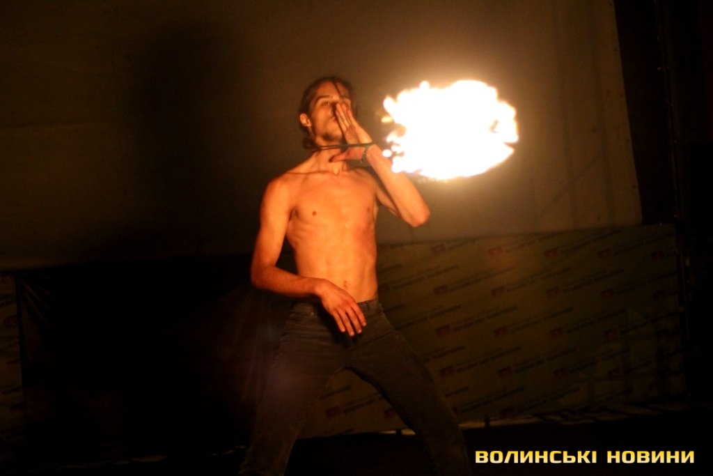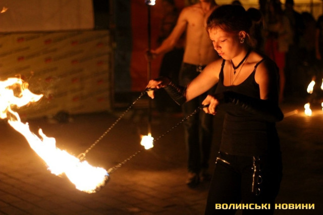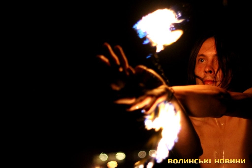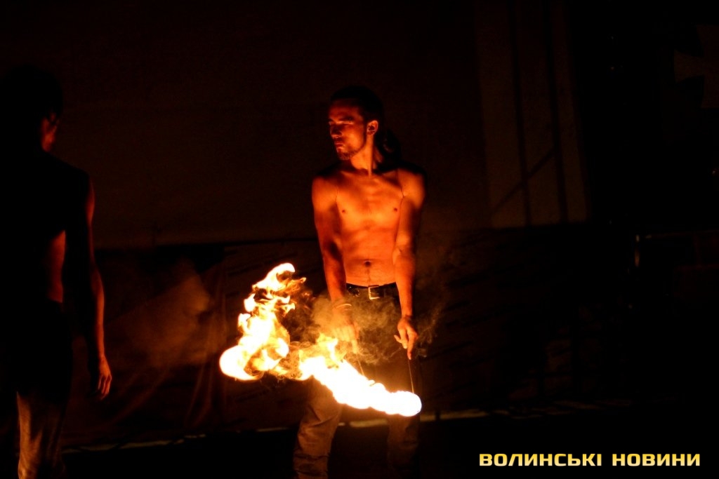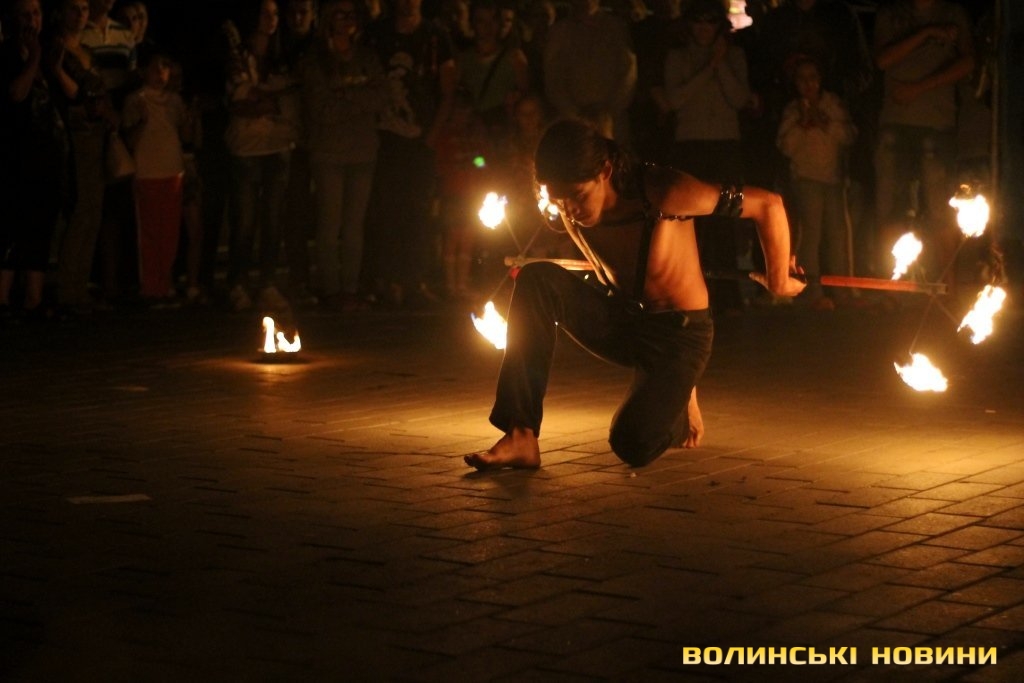 Театр тіней «По ту сторону» та театр вогню «Воїни небес» показали дійство на Театральному майдані у Луцьку, 23 серпня.
