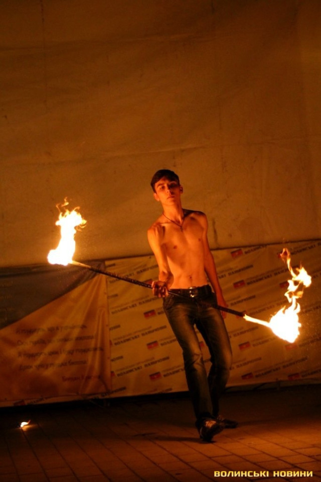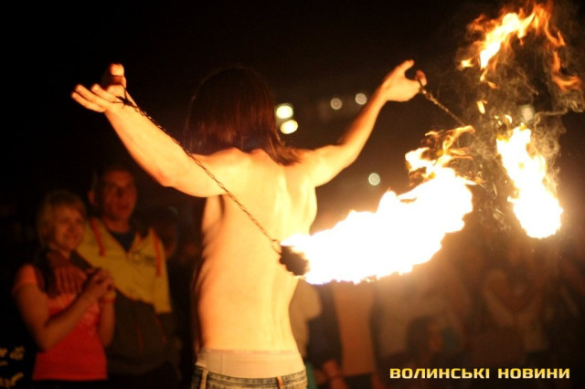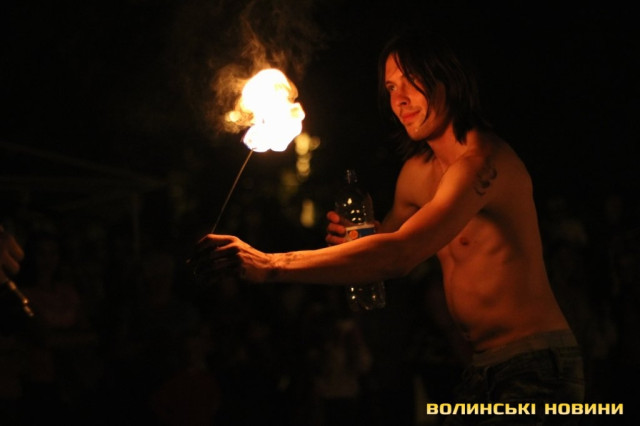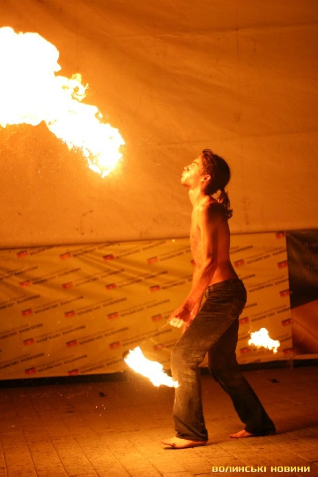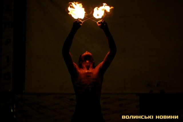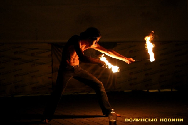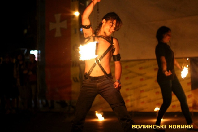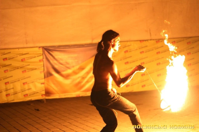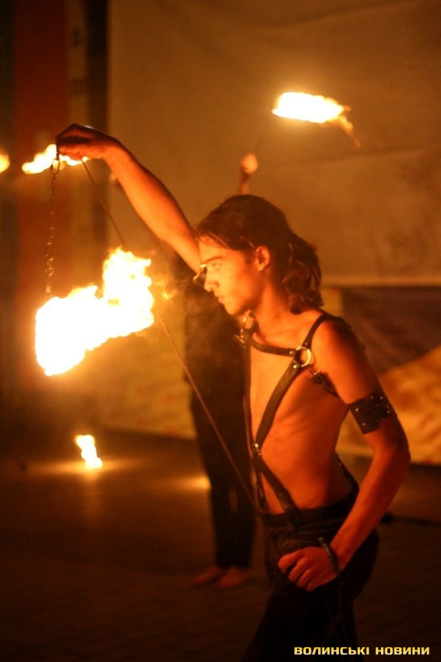 Після театру тіней глядачів розважали артисти театру вогню «Воїни небес», які викликали захват публіки небезпечними трюками з вогнем.