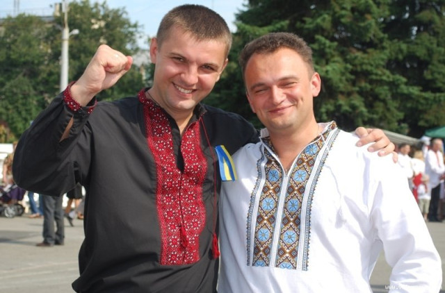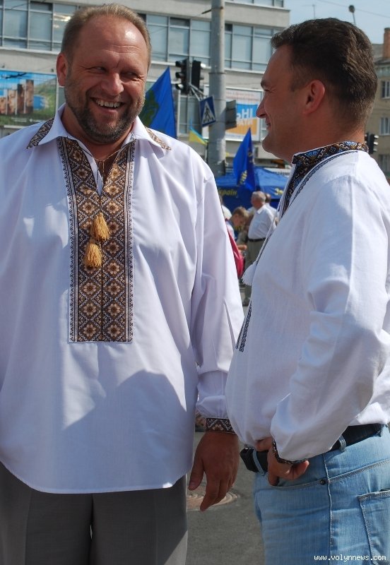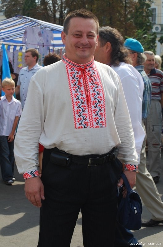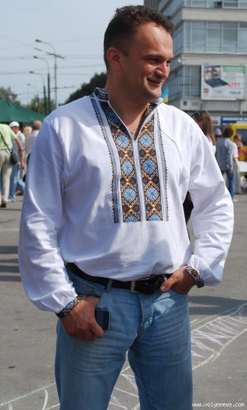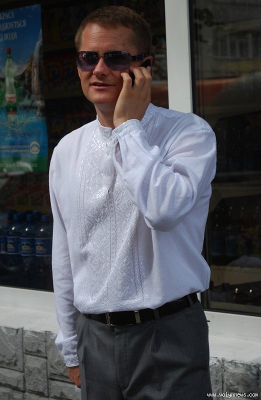 Директор центру муніципальних реформ, екс-заступник мера Луцька Владислав Стемковський українську сорочку поєднав з голубими джинсами. Ай-фон у руці - ознака того, що про справи не можна забувати й у свято.