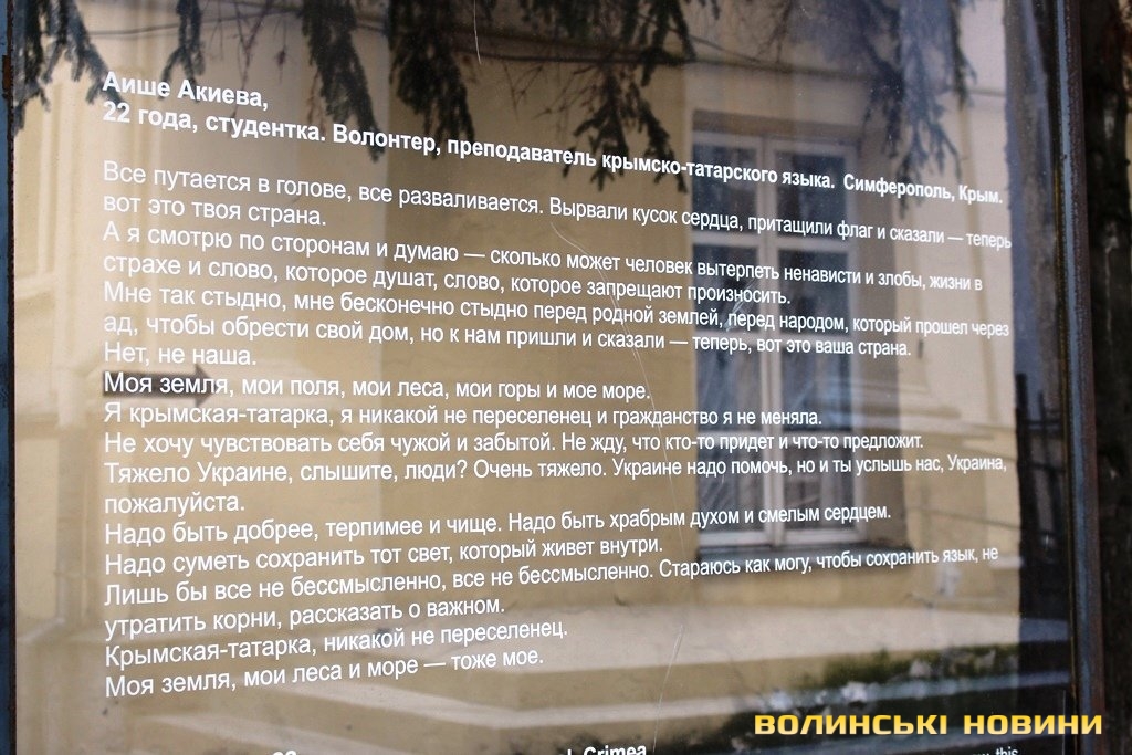 «Вам рассказать грустную историю или веселую? У меня все равно ни той, ни другой нет. Все разделилось надвое – дом пополам и сердце тоже. В Евпатории остался отец, а здесь мы с мамой, сестрой и братом. Мы уехали сразу после референдума потому, что там стало невозможно жить. Переселенец – это человек, который вынуждено ищет свой дом, мне так кажется. Я как раз нахожусь на этом пути. Пути поиска и определения. Очень помогают люди, они вдохновляют своими историями и примерами, своим отношением.