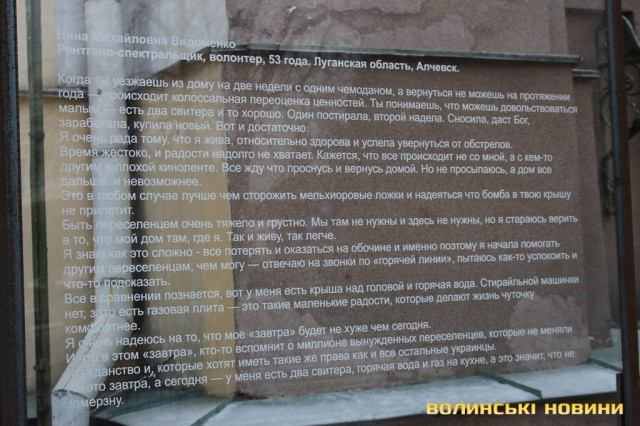 «Когда ты уезжаешь из дома на 2 недели с одним чемоданом, а вернуться не можешь на протяжении года – происходит колоссальная переоценка ценностей. Ты понимаешь, что можешь довольствоваться малым – есть два свитера – и то хорошо. Один постирала, второй надела. Сносила, даст Бог – заработала, купила новый. Вот и достаточно. Я очень рада тому, что я жива. Кажется, что все происходит не со мной. Все жду, что проснусь и вернусь домой, но не просыпаюсь. Мы там не нужны, и здесь – не нужны. Но я стараюсь верить в то, что мой дом там, где я. Так и живу, так легче. Я очень надеюсь на то, что мое «завтра» будет не хуже, чем сегодня. А сегодня у меня есть два свитера, горячая вода и газ на кухне, а это значит, что не замерзну», – розповідає жінка.Фотовиставка вразила присутніх лучан, пані Людмила впевнена, що це допомагає краще зрозуміти українців з різних регіонів.