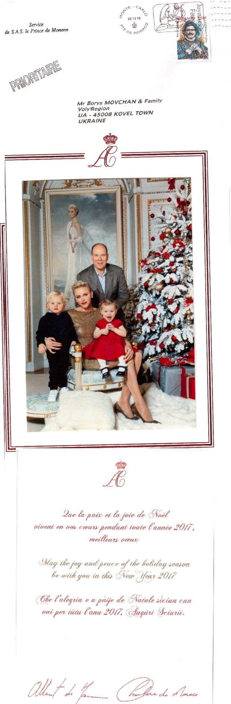 Князівська родина Монако вболіває за українців і бажає їм миру і святкового щастя протягом 2017 року. До князівської родини долучилися і Король Бельгії Філіп з Королевою Матильдою та юними принцами і принцесами: Єлизаветою, Габріелем, Еммануїлом, Елеонорою.