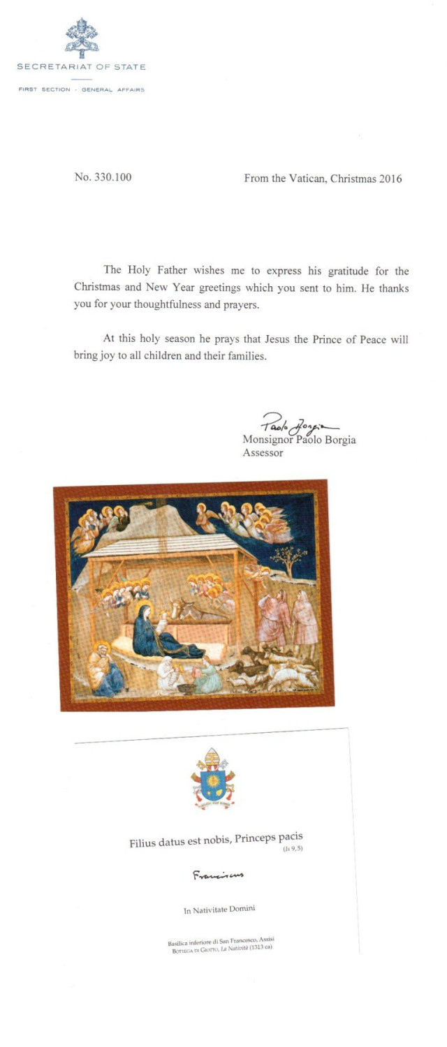 Цього року в листі з Ватикану люб’язно повідомили, що Папа Римський молиться про те, щоб Ісус – Князь миру приніс щастя для всіх дітей і їхніх сімей.