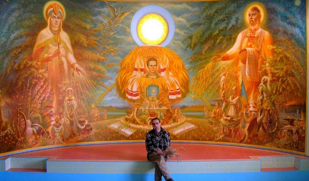 У 2007 році за значний внесок у вивчення і популяризацію міфології слов’янських народів Віктору Крижанівському було присвоєно звання доктора філософії образотворчого мистецтва Кінгстонського університету США. Художник виконав численні розписи храмів Рідної Віри у різних локаціях України. На цьому фото – Віктор Крижанівський біля власного розпису в Святині (храмі) Різдва Лева Силенка, засновника Рунвіри. Сакральні твори художника Сонцеслава сьогодні зберігаються в кожному рідновірському домі – і в Україні, і за кордоном.
