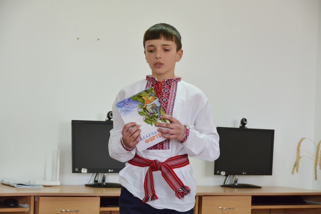 Шестикласник Денис Романюк із села Секунь не лише розповів про свою улюблену збірку Остапа Вишні «Веселі усмішки», а й продекламував уривок із гумористичного оповідання «Ага, будеш?!».«Кожна гумореска з цієї книжки – окрема історія, яка має глибокий зміст. Удома я часто читаю твори Остапа Вишні вголос, ми усією сім’єю сміємося. Читайте і смійтеся на здоров’я», – звернувся до присутніх школяр.