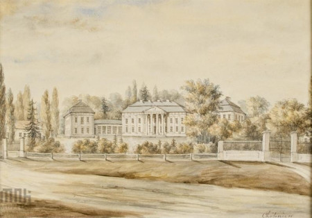 На другий поверх із холу вели масивні дубові сходи. У кімнатах був кольоровий паркет з геометричним орнаментом. Стелі декоровані ліпленням. Кімнати прикрашали білі мармурові каміни в стилі Людовіка XVI. Над камінами з позолоченими годинниками висіли дзеркала. Усі покої містили меблі першої чверті ХІХ століття. Серед картин виділялися родинні портрети та мініатюри. Була велика бібліотека та колекція порцеляни. У середині ХІХ століття тут бував Наполеон Орда. Цілком зрозуміло, що палац з парком надихнув художника і він змалював його.