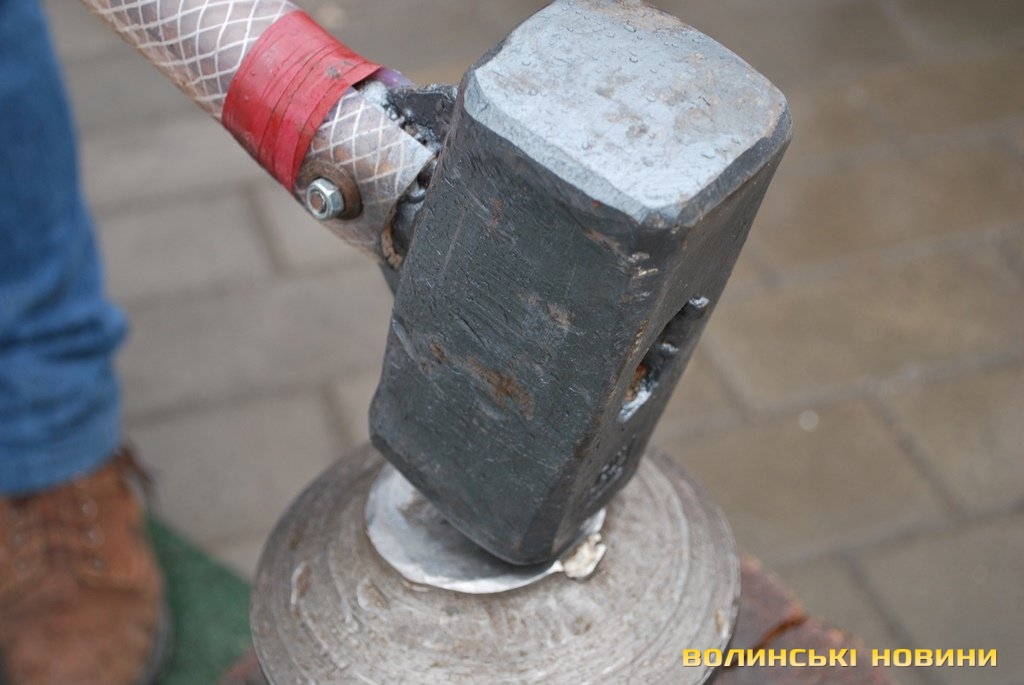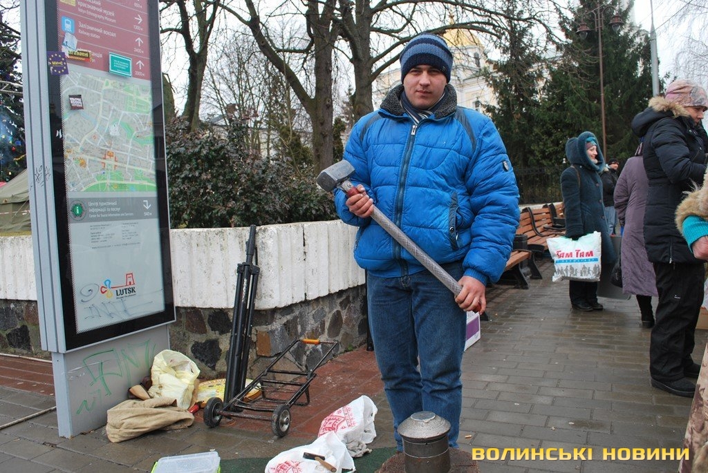 Свічку, вага якої 82 кілограми і висота майже 1,8 метра, привезли у центр Луцька волинські бджолярі. Напередодні її освятили в церкві. Вони кажуть, що свічка виганяє нечисту силу і приносить Божу благодать.