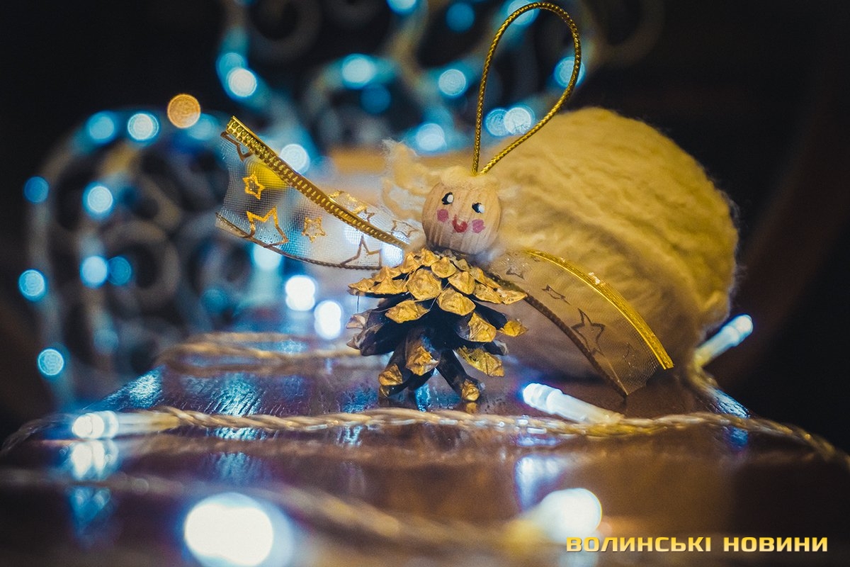 Постійна ведуча улюбленого заходу дітей та дорослих — майстриня Ірина Сардак-Бондарук переконує: головне фантазія майстра. Саме завдяки ній, навіть у найпростіших речах, можна побачити майбутній витвір. То ж і на сьогоднішньому занятті, його гості мали можливість переконатися, як звичайна шишка, дерев’яна намистина, стрічка та мотузка перетворюються на оригінальний декор.Вибір для створення іграшки образу саме янголятка, пояснює Ірина Сардак-Бондарук, зумовлений новорічно-різдвяною атмосферою. До того ж і канікули ще тривають, і свята попереду, і ялинки у оселях ще стоять. То ж підвіска займе гідне місце серед інших прикрас, адже вона особлива тим, що зроблена власними руками.Перед початком роботи майстриня роздала усім заготовки тулубу — соснову шишку. Кожен розмальовував її, відповідно до фантазії. Далі, за допомогою клеєвого пістолету, до основи приклеїли намистину — голову янгола, зі шнурівкою для підвішування іграшки.Із шерстяної мотузки створили волоссячко прикраси, яке, за допомогою ПВА, прикріпили до намистини. Колір мотузки можна обирати будь-який. Також «зачіску» можна оздобити — відповідно до фантазії. Матеріалом для крил стала стрічка з новорічним принтом, з обох сторін якої є дріт — він відіграє роль своєрідного каркасу. Відрізок стрічки, перекручений декілька разів по середині, також потрібно приклеїти до шишки. Хоча для крилець згодитися будь-який матеріал, аби він нагадував за формою мініатюрний бантик.Наостанок майстрам — малим і дорослим, знадобилося максимуму уваги, адже вони перейшли до розпису обличчя. Тонким пензликом потрібно було намалювати 2 рожеві кружальця — щічки янголятка, 2 чорні крапочки — його очі (з надзвичайно маленькими плямками, які імітують блиск світла) та мініатюрний ротик.Готовий витвір можна задекорувати білим акрилом, який буде нагадувати паморозь, або ж золотим. Тоді підвіска матиме дещо вінтажний вигляд — наче антикварна прикраса. В цьому випадку, ще раз повторює Ірина Сардак-Бондарук, усе обмежується художнім смаком і фантазією автора.
