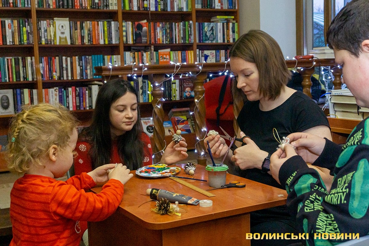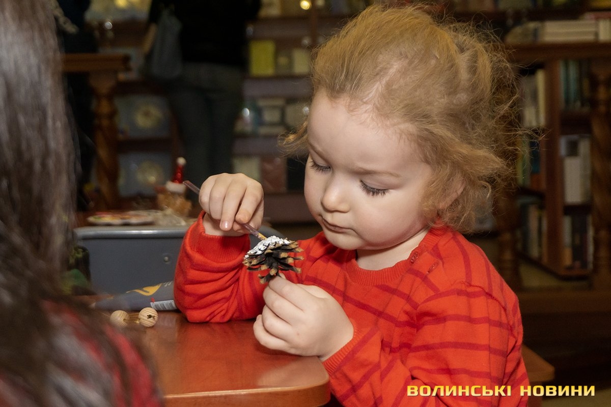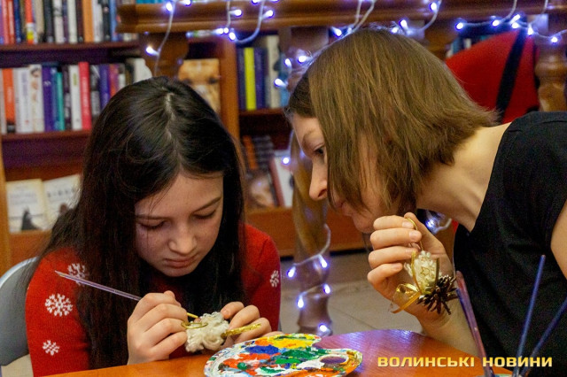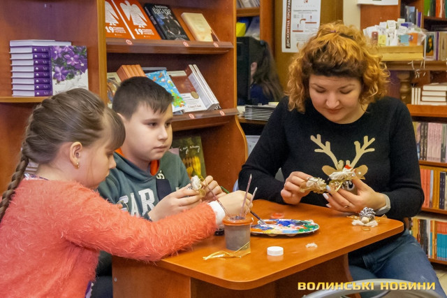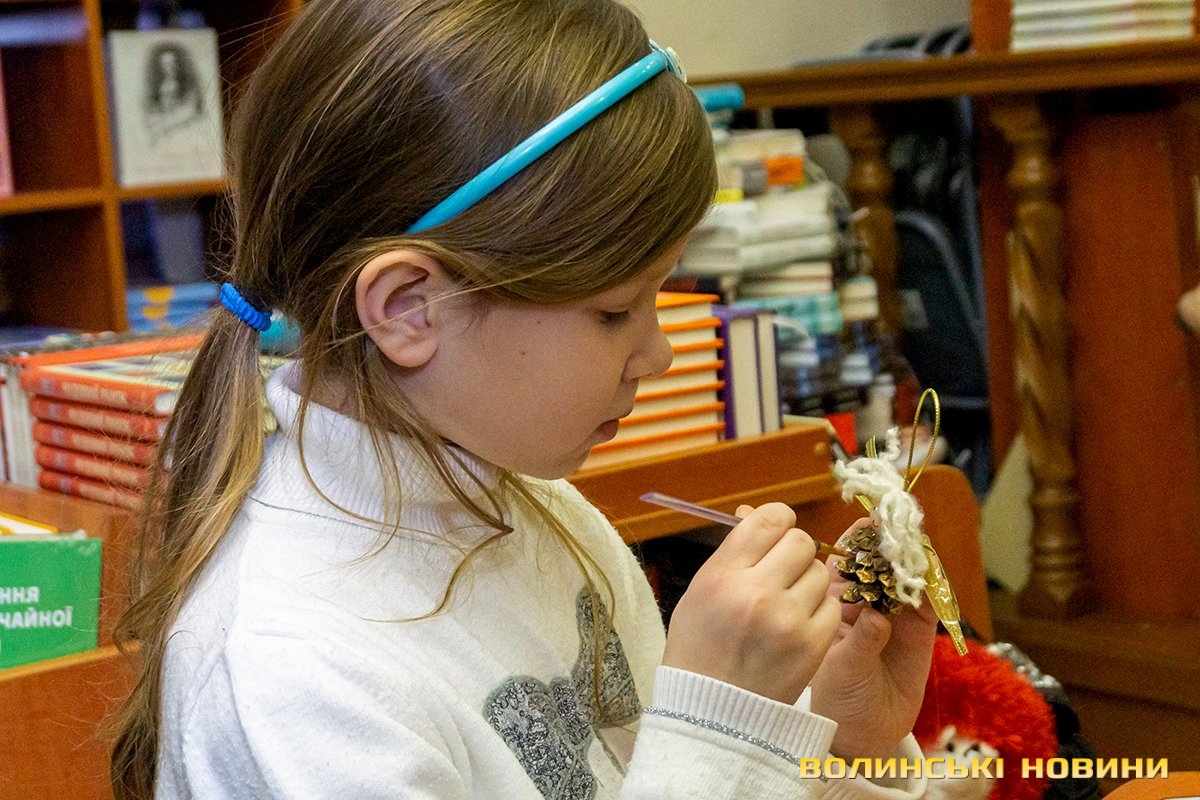 У луцькій книгарні «Є» відбувся традиційний суботній майстер-клас. Цього разу його темою були новорічно-різдвяні свята — діти виготовляли прикраси-підвіски у вигляді янголят.