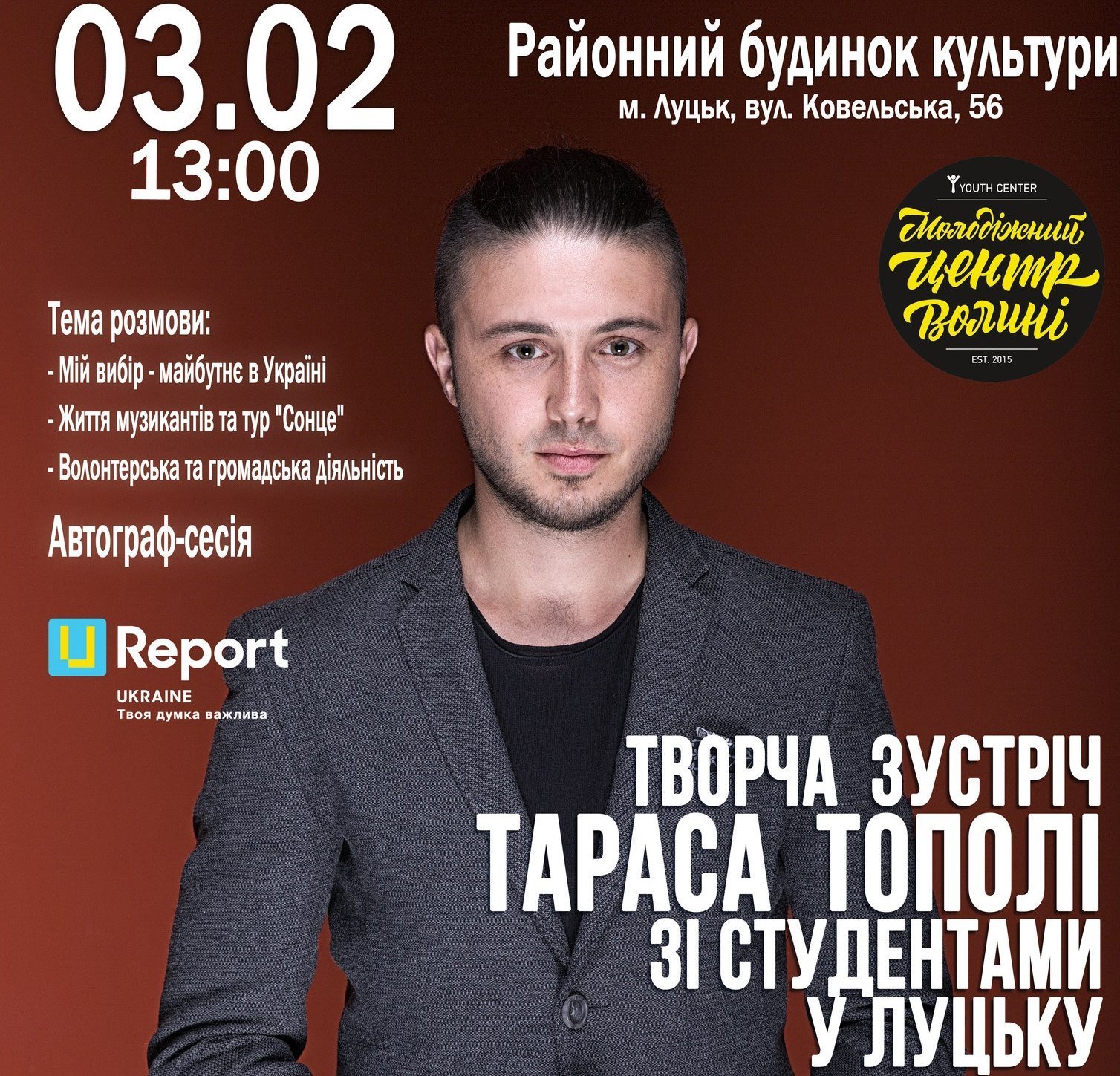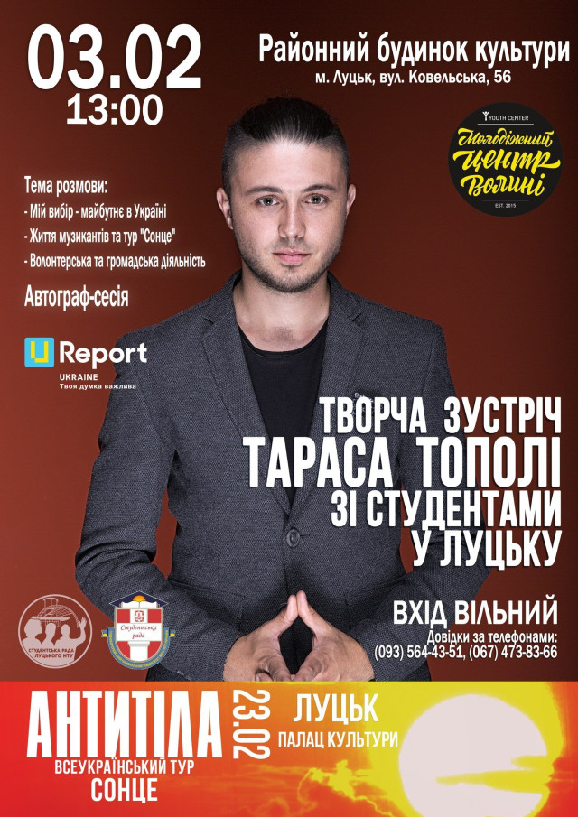 Творча зустріч лідера гурту Антитіла Тараса Тополі зі студентами та шанувальниками відбудеться у Луцьку.