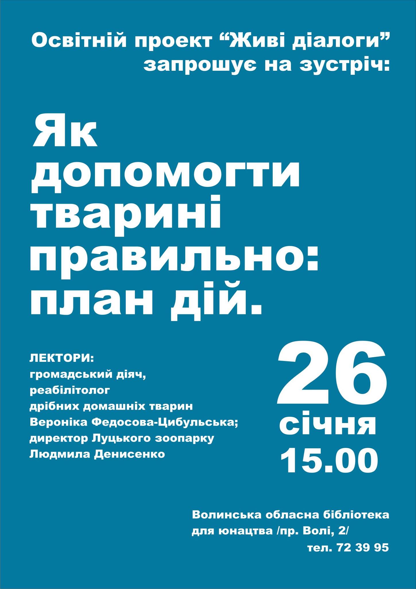 «Як допомогти тварині правильно: план дій» – на чергову лекцію з такою назвою запрошують лучан та гостей міста організатори освітнього проекту «Живі діалоги».
