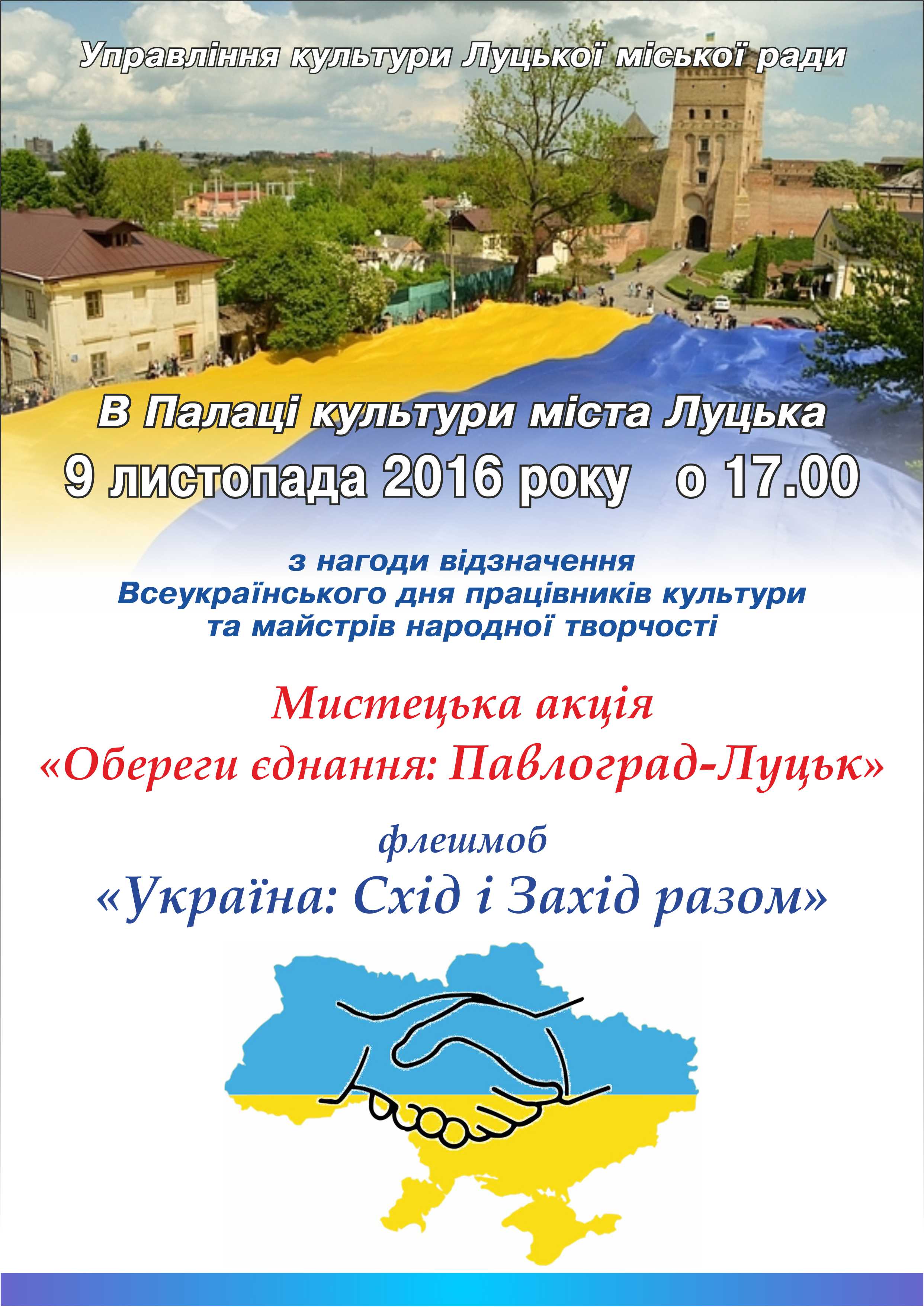 Зокрема, акція відбудеться у Палаці культури міста Луцька. Під час цього запланований флешмоб «Україна: Схід і Захід разом».