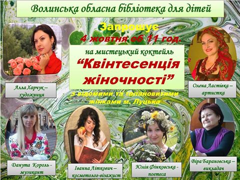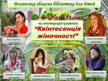 Волинська обласна бібліотека для дітей запрошує користувачів та гостей на мистецький коктейль «Квінтесенція жіночності», пише Район.Луцьк.