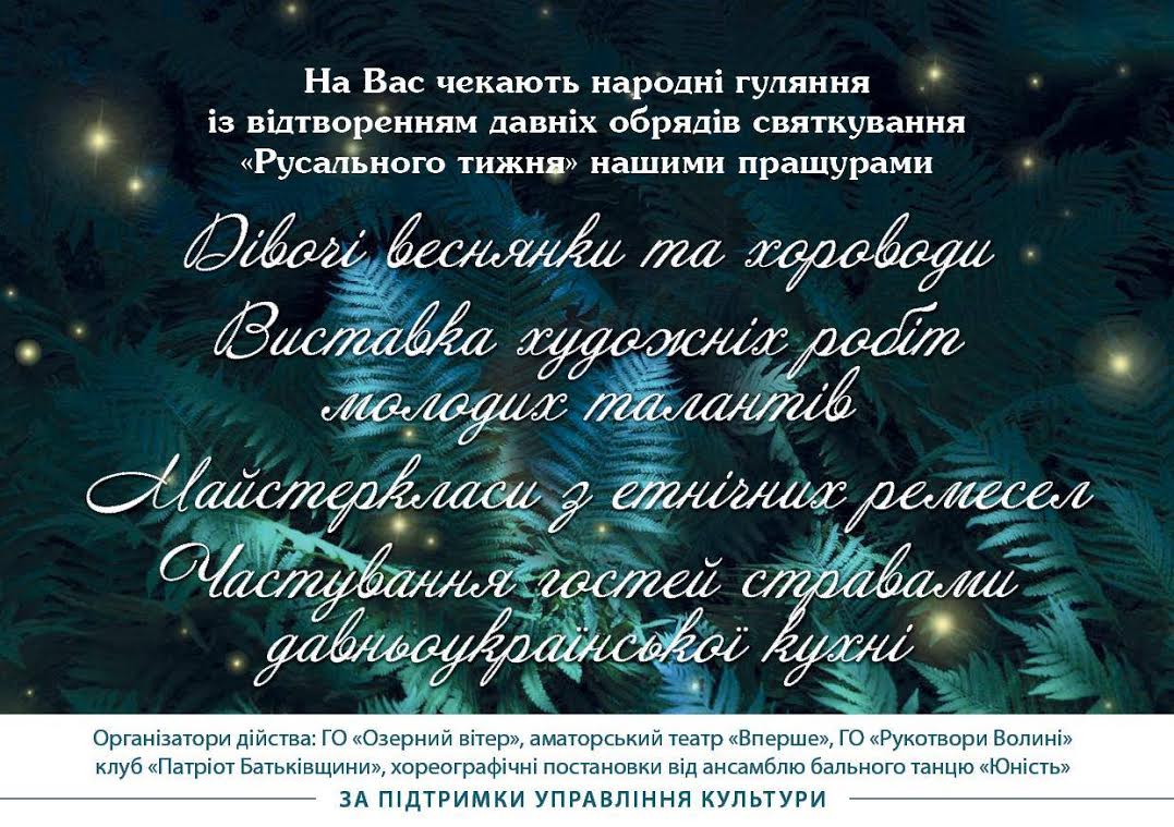 Дійство відбуватиметься на «Русальний тиждень», саме так колись у народі називали «Зелені свята». Тому увесь вечір буде суцільною містерією оповитою давніми легендами.