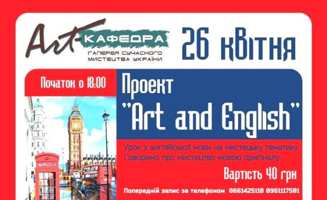 Проект «Art and English» презентують 26 квітня о 18.00 в Галереї сучасного мистецтва України «Art-Кафедра», що в спортивно-оздоровчому комплексі «Адреналін Сіті».