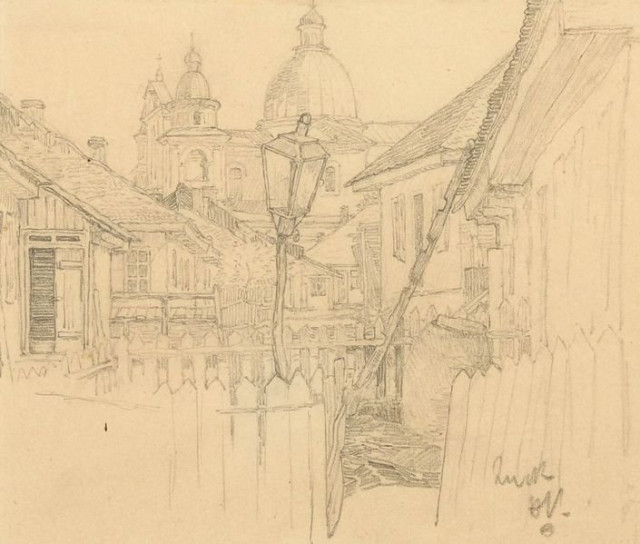 Кафедральний собор святих апостолів Петра і Павла, будівля якого зображена з відомої кожному лучанину точки єврейської забудови на перетині вулиць Данила Галицького і Михайла Драгоманова, дуже своєрідний ракурс з таким незвичайним ліхтарем на передньому плані (чи був той ліхтар насправді?) – таким є зображення луцької вулички на полотні німецького художника Генріха Фогелера, зроблене приблизно у 1915 році під час його перебування у нашому місті.
