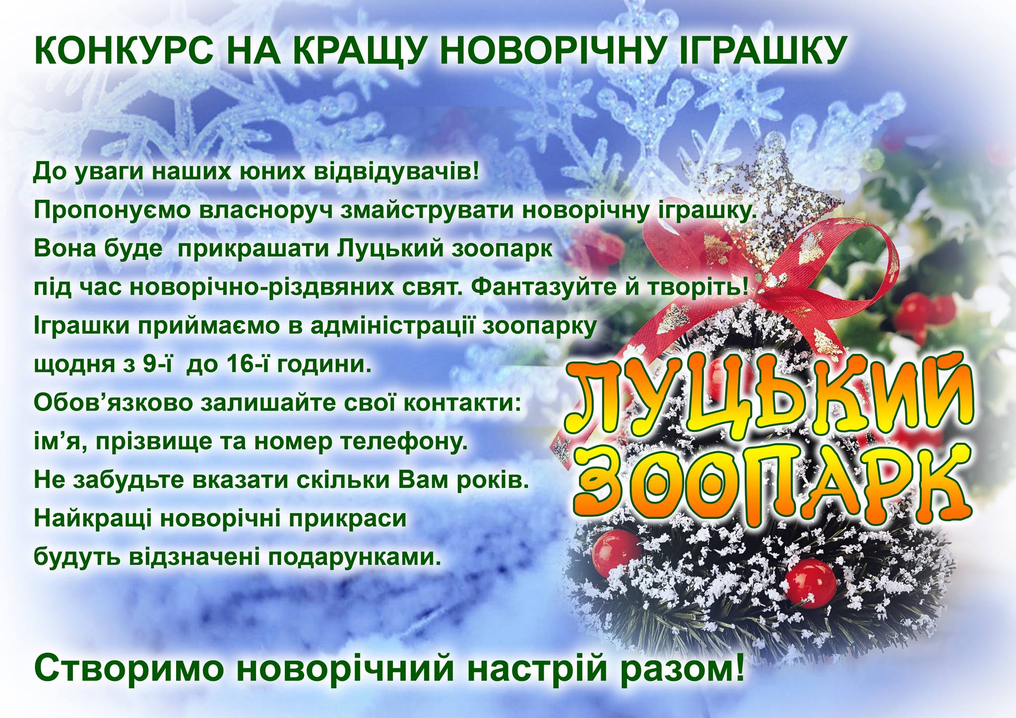 До слова, Луцький зоопарк оголошує конкурс на кращу новорічну іграшку. Власноруч змайстровані новорічні іграшки будуть прикрашати зоопарк під час різдвяно-новорічних свят, а автори найкращих новорічних прикрас будуть відзначені подарунками.