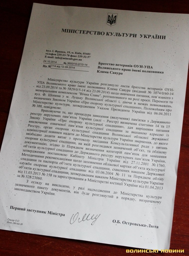 Позбавити меморіальний комплекс «Вічна слава» статусу об’єкта національної спадщини вимагають представники братства ОУН-УПА Волинського краю імені Клима Савура.