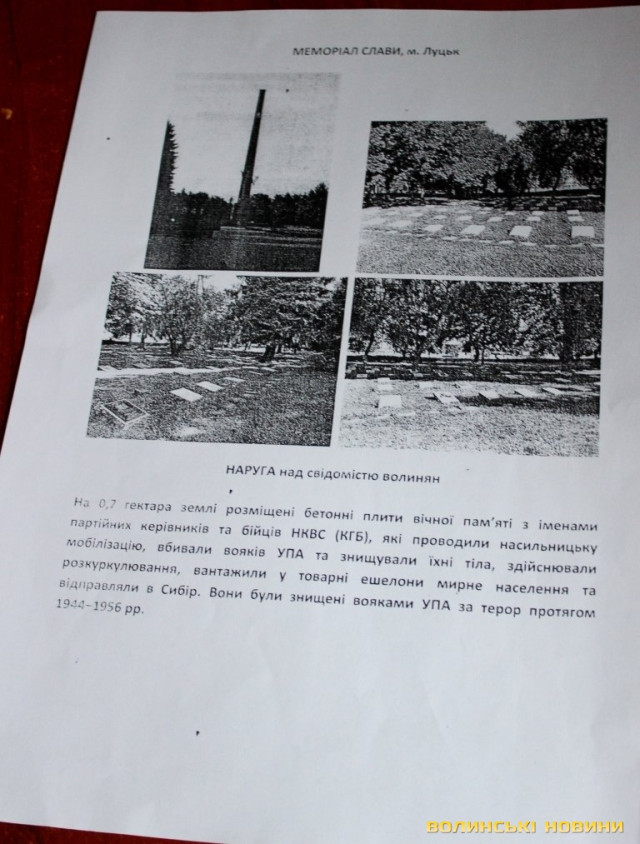 На мемориале хоронили в свои года всех, то останки после 1-й мировой, то после 2-й. Вопрос об установлении памятников ОУН-УПА, по-моему, должна решать именно городская община, сами жители Луцка, ведь вопрос, согласитесь, весьма спорный. Так же как и то, сносить ли плиты или нет. Почему всякие Засекины и его группка лиц должны решать эти вопросы и сколько на них тратить деньги из бюджета??? И вообще какого, простите, Х***рена самые острые политические и истрические нюансы должны подниматься в то время, когда в стране творится черти что? Засекину бы писать ходатайства Президенту о том, что нам не во что солдат одевать!!!