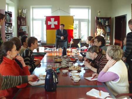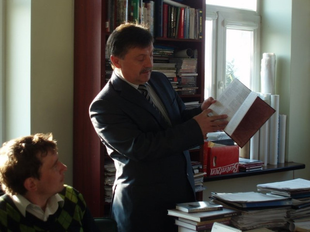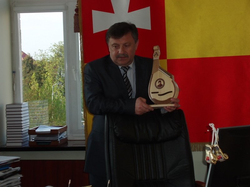 Богдан Шиба продемонстрував присутнім одну з останніх придбаних книг, - про гетьмана Івана Виговського. Показав майбутнім гідам й інші цікавинки, що знаходяться в його кабінеті – самурайський меч, а також щит і меч, стилізовані під середньовічну епоху, сувенірну кобзу, подаровану Національною спілкою кобзарів України.
