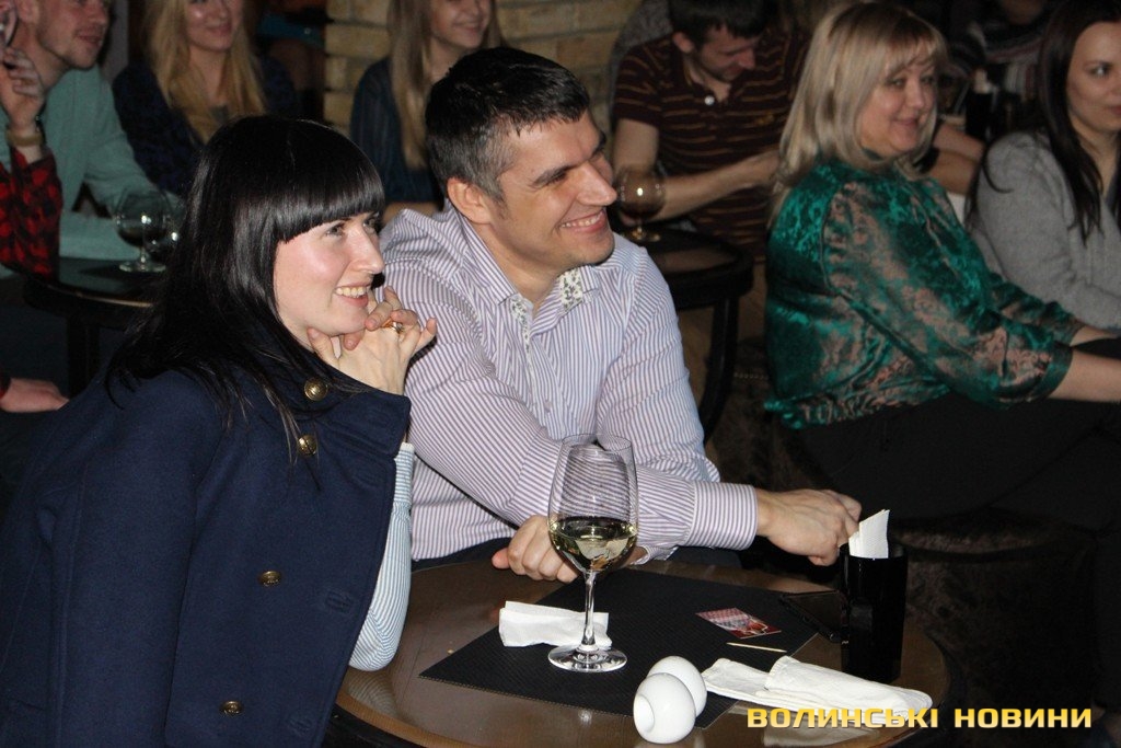 Дмитро та Микола приїхали не з простими жартами, а «стилізованими» під Луцьк та лучан. Так, цікавою була мініатюра, в якій чоловік дивиться футбол по телевізору і вболіває за «Волинь». Причому герой знає не лише назву клубу, а й імена гравців команди.І наостанок «Вечерние Мотыльки» показали постановку, в якій чоловік приходить додому і його зустрічає розгнівана дружина. Вона демонструє тому айфон і питає, хто це пише йому есемески «Дякую за прекрасну ніч» тощо. Події розгортаються таким чином, що вже після мініатюри гумористи радять: «Коли даруєте один одному айфони, беріть хоча б різні чохли».Зазначимо, що захід мав відбутися у неділю, 15 березня, але його перенесли. ТОго дня у Луцьку був День жалоби за загиблими рядовим міліції спецроти «Світязь» Мирославом Столярчуком та старшим лейтенантом 128 бригади Денисом Чабанчуком.