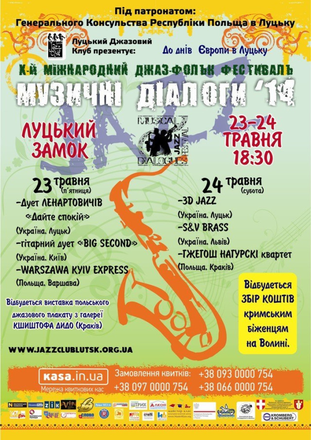 За сприяння: Волинської облдержадміністрації, Луцької міської ради, ТОВ «Кромберг & Шуберт», Волинської обласної філармонії та рекламної компанії «Штрих».10-й Міжнародний джаз-фольк фестиваль «Музичні діалоги» у Луцьку відбудеться 23-24 травня, у Замку Любарта. Початок о 18:30.