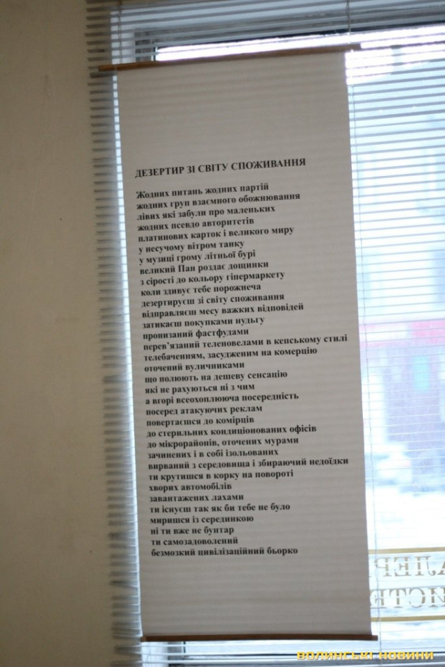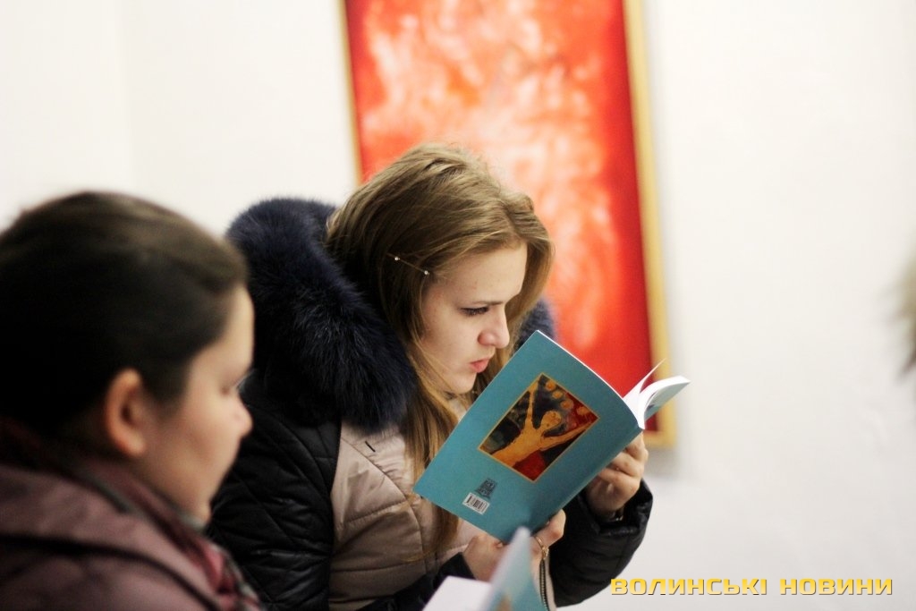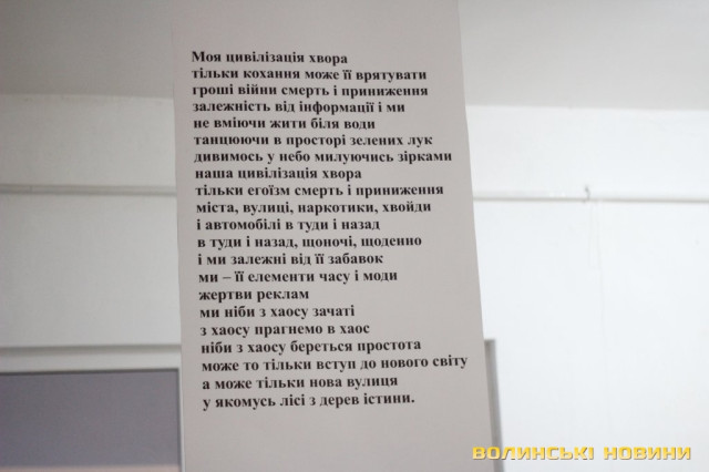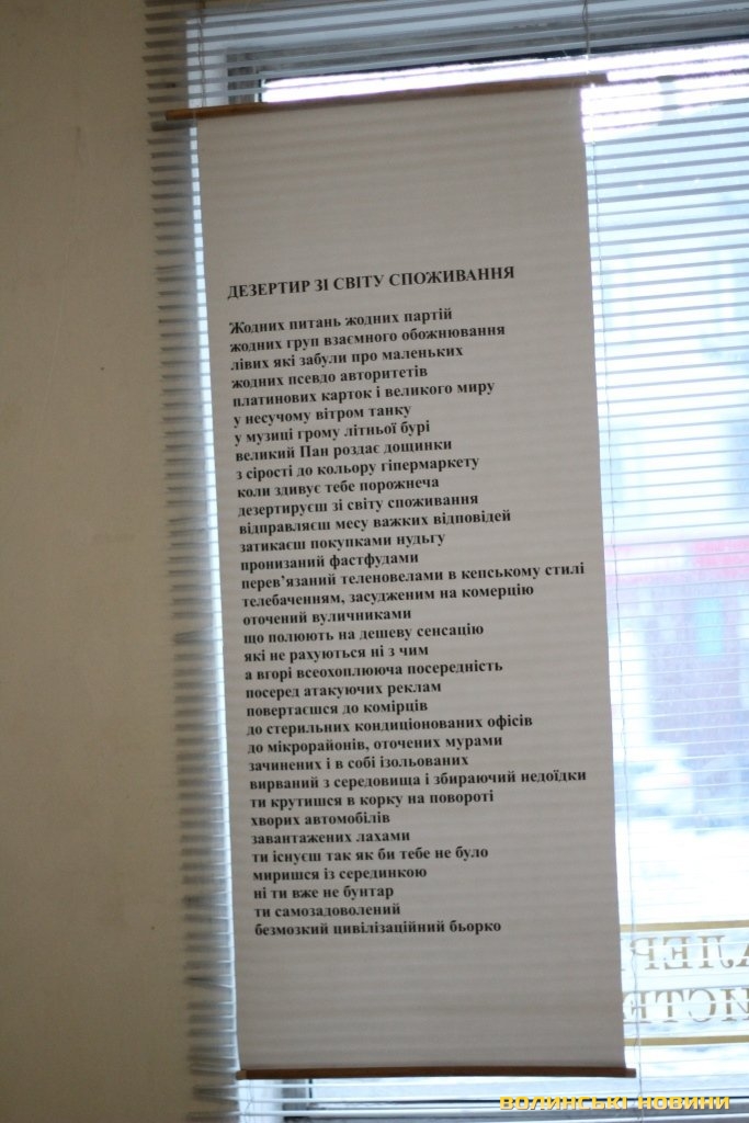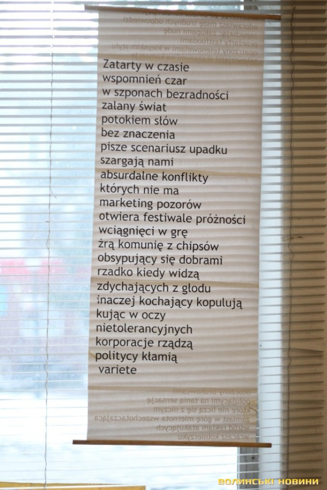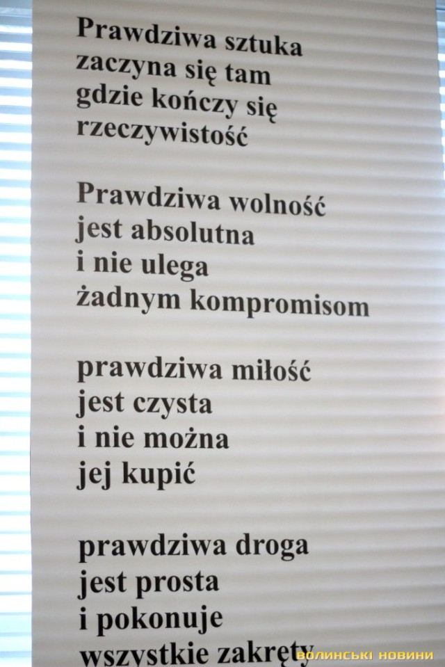 Кшиштоф Косцєша – не лише художник, а й поет, тож цього дня презентували його вірші, вперше опубліковані у перекладі волинських поетів. Поезію митця можна було прочитати також на банерах, які були розвішені у залі галереї.