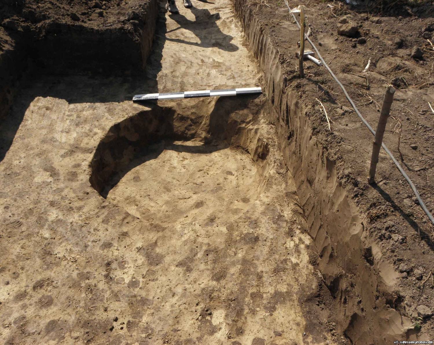 У північній та південній частинах котловану викопали дві траншеї. В одній з них археологічних матеріалів виявлено не було, але в іншій знайшли матеріали матеріали празько-корчацької культури: господарську яму та цілий горщик давніх слов’ян. Тут проходила межа поселення слов’янської спільноти, кажуть археологи.