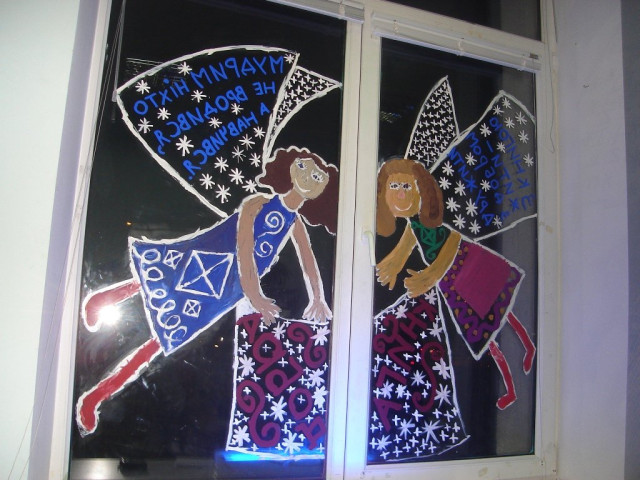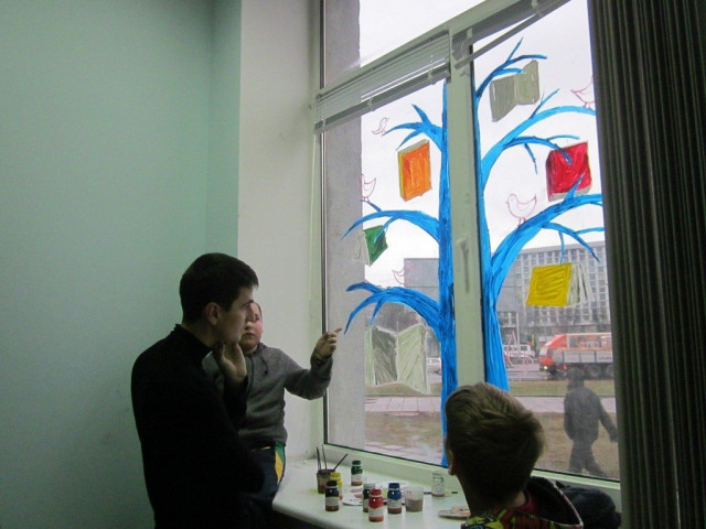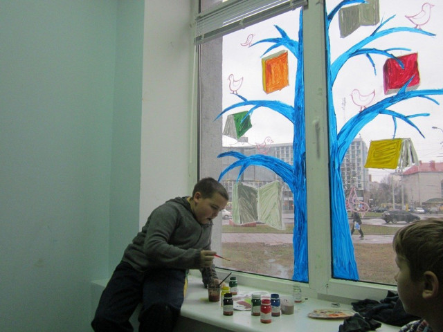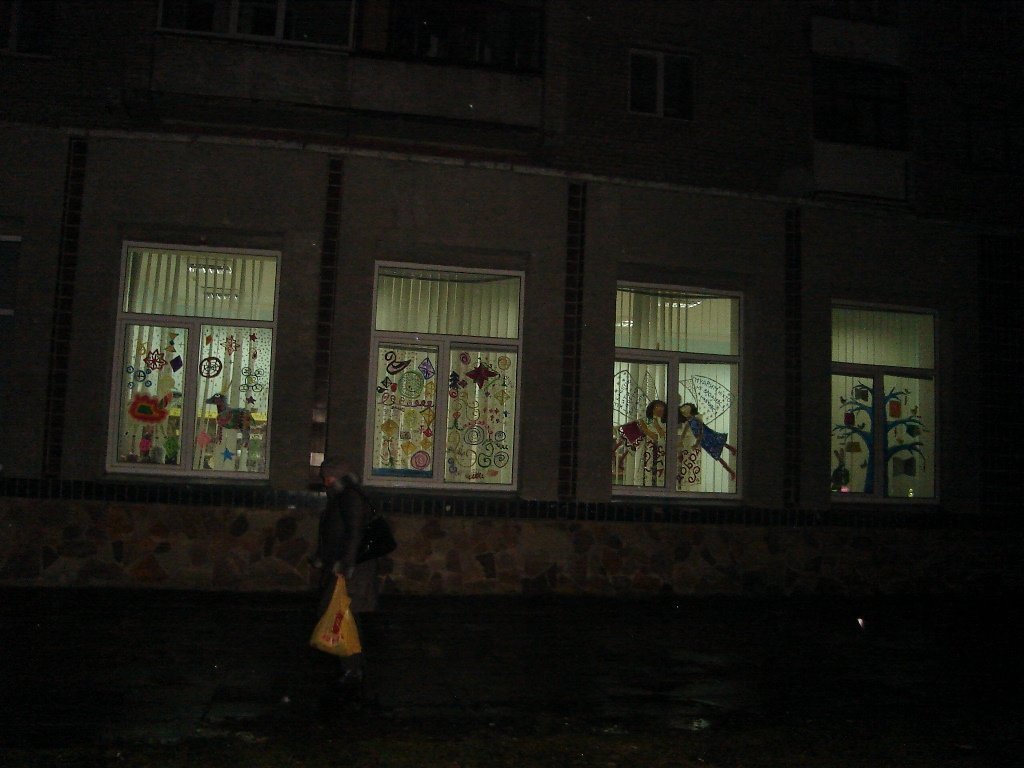 Так сьогодні виглядають вікна центральної бібліотеки для дітей. Незвичний, чудовий, творчий подарунок для колективу бібліотеки, її читачів та й усіх мешканців міста зробили діти з дитячої художньої студії « Мальованка» (керівники Богдан Осіюк та Галина Палазнік).