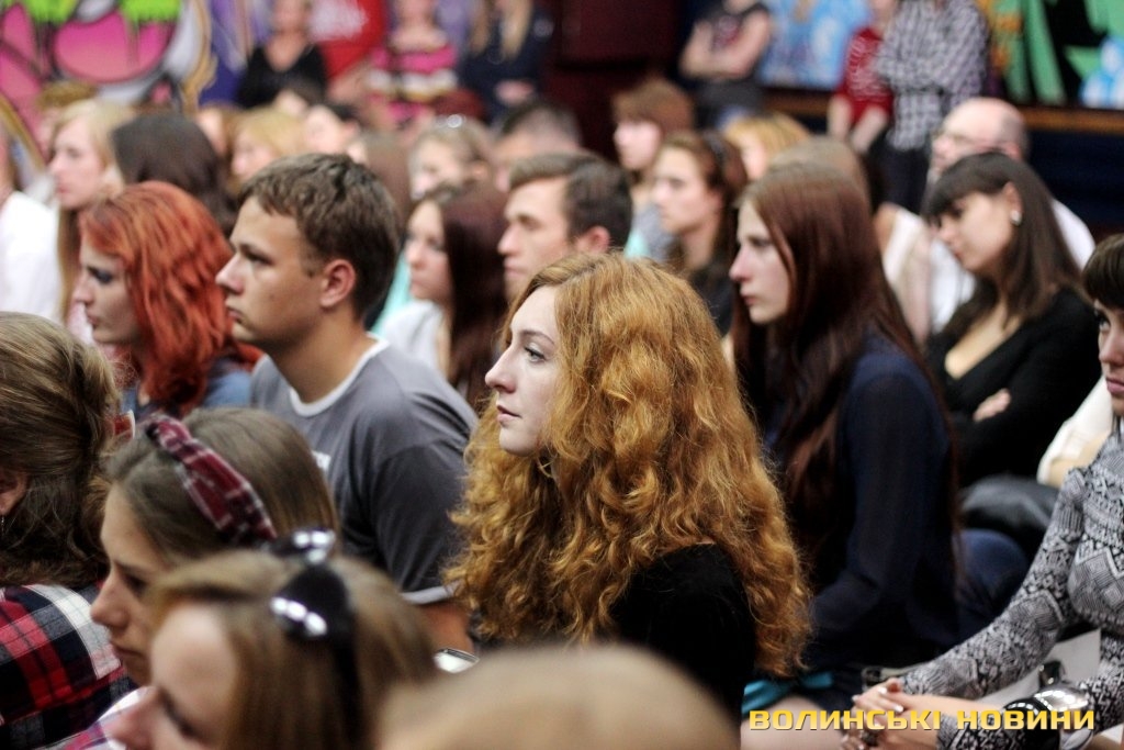 Для того, щоб послухати відомого сучасного українського письменника, учасника мультимедійних мистецьких проектів та акцій громадянської непокори зібралося чимало лучан, серед яких переважала молодь. Під час заходу письменник розповів, що сьогодні, разом із гуртом «Собаки в космосі» презентує диск, що називається «Бийся за неї» - третій студійний альбом письменника та музичного колективу. Видали його у вигляді книги-коміксу, який можна розглядати під час прослуховування диску. Сергій Жадан зауважив, що йому дуже дивно та незвично презентувати комікс. Тих, хто хоче найкраще познайомитися із музикою, він запросив на концерт, а сьогоднішній вечір майже увесь присвятив читанню поезії.