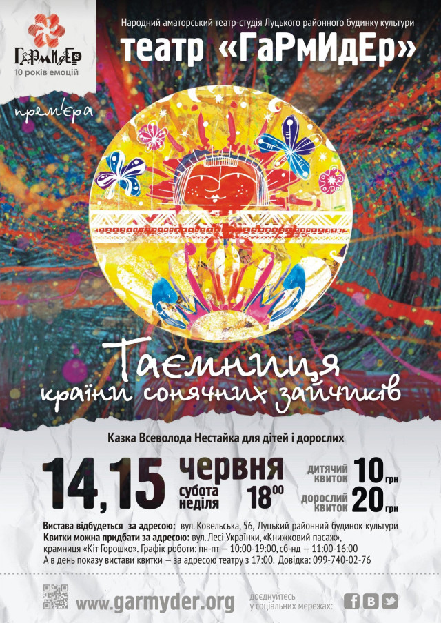 «Таємницю країни сонячних зайчиків» розкриють у Луцьку. На прем’єру вистави для дітей і дорослих запрошує луцький театр «ГаРмИдЕр». Про це йдеться на сайті театр-студії.