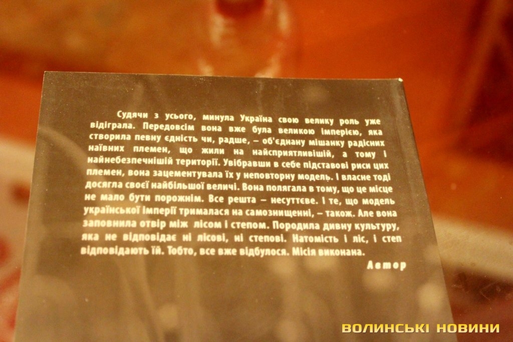 Під час зустрічі з лучанами письменник зачитав фрагменти книги. Так, розділ «Безсмертні рухи» торкається теми того, як багато рухів щодня вмирає. Зокрема зникає певна пластика, здатність людського тіла до певної послідовності рухів – щоразу менше косять, гострять інструменти тощо.