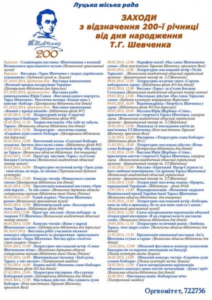 9 березня цього року Україна відзначатиме 200 років від дня народження Тараса Шевченка. До того ж, 2014 рік проголошений Роком Тараса Шевченка. Тож з метою відзначення цієї знаменної дати у Луцьку заплановано ряд заходів, які відбуватимуться протягом року у нашому місті, - повідомили у відділі інформаційної роботи міської ради.