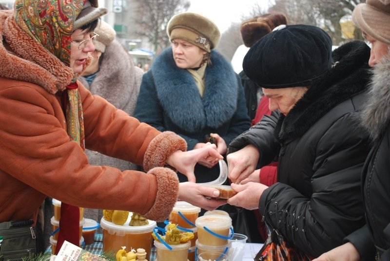 Виступивши на сцені, артисти пішли «в народ» аби продовжити колядувати. А заодно - зібрати гостинців. В першу чергу колядники обійшли палатки учасників медової ярмарки, де зігрілися та отримали солодкі подарунки.