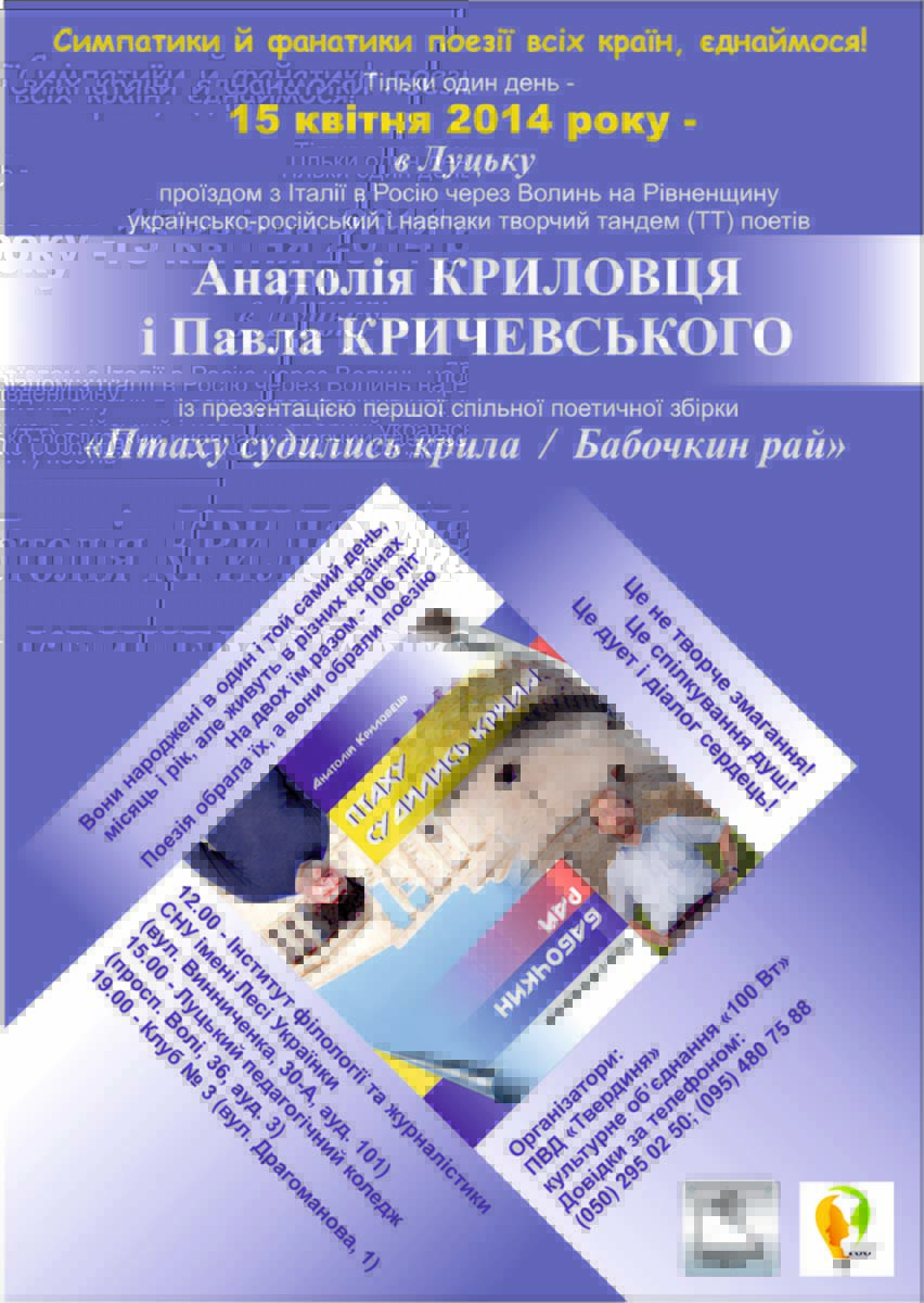 Співавторами поетичної збірки стали українець Анатолій Криловець та Павло Кричевський, котрі народилися в один день, місяць і рік, проте в різних країнах.