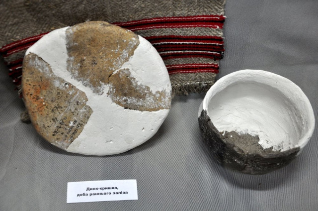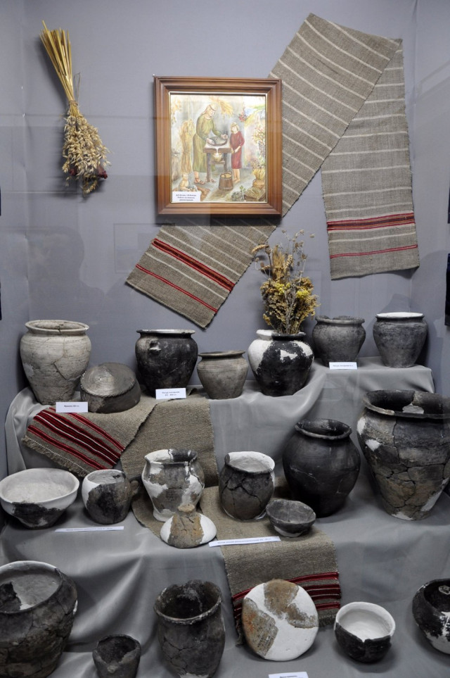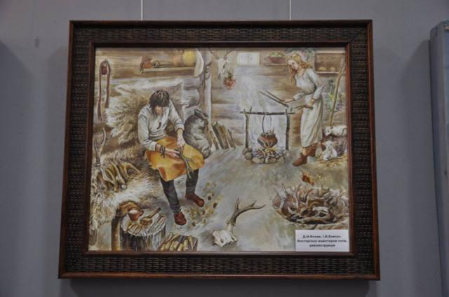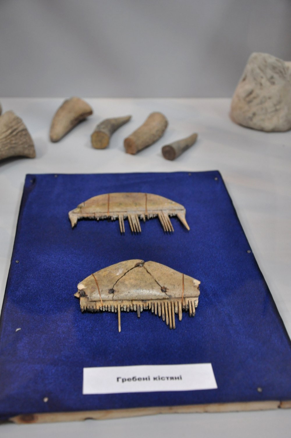 На виставку відібрали тільки найбільш цікаві знахідки, а решту зберігають у фондах музею. Над вітринами висять роботи-реконструкції художниці Ірини Ковтун – на них зображено, як мешкали, полювали та готували собі їжу у давнину.