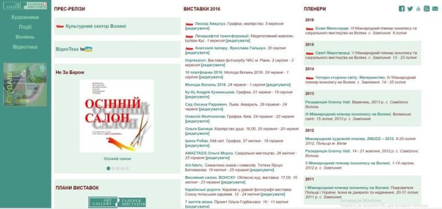 Веб-сайт відображає виставкову діяльність Галереї мистецтв та дає можливість не лише прослідкувати за анонсами виставок і подій у її Великій, Малій та Нижній залах, а й побачити повні фото-звіти з презентацій, познайомитися з біографіями, творчістю сучасних волинських художників. Діяльність Галереї охоплює організацію Міжнародного пленеру іконопису і сакрального мистецтва у Замлинні Волинської області у співпраці з Генеральним консульством Польщі у Луцьку.