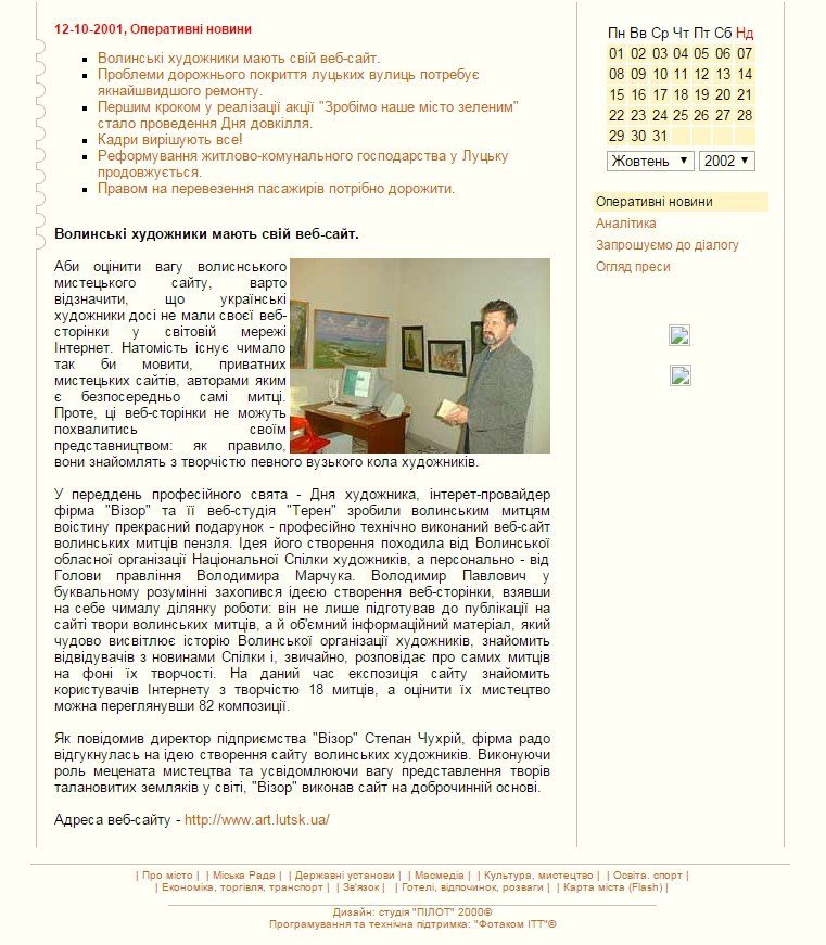 15 років тому напередодні професійного свята Дня художника волинським мистцям зробили особливий подарунок – інтернет-провайдер «Візор» та його веб-студія «Терен» створили та передали художникам веб-сайт. 11 жовтня 2001 року відбулася урочиста презентація сайту у стінах Галереї мистецтв Національної спілки художників України. На той момент контент сайту складали біографії 18 волинських художників та 82 експозиції їхніх творів.