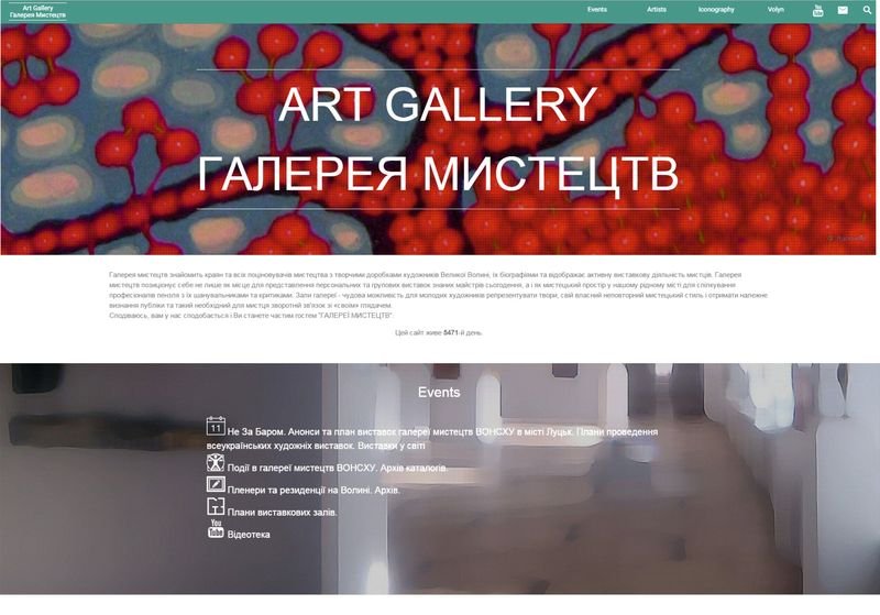 Веб-сайт відображає виставкову діяльність Галереї мистецтв та дає можливість не лише прослідкувати за анонсами виставок і подій у її Великій, Малій та Нижній залах, а й побачити повні фото-звіти з презентацій, познайомитися з біографіями, творчістю сучасних волинських художників. Діяльність Галереї охоплює організацію Міжнародного пленеру іконопису і сакрального мистецтва у Замлинні Волинської області у співпраці з Генеральним консульством Польщі у Луцьку.
