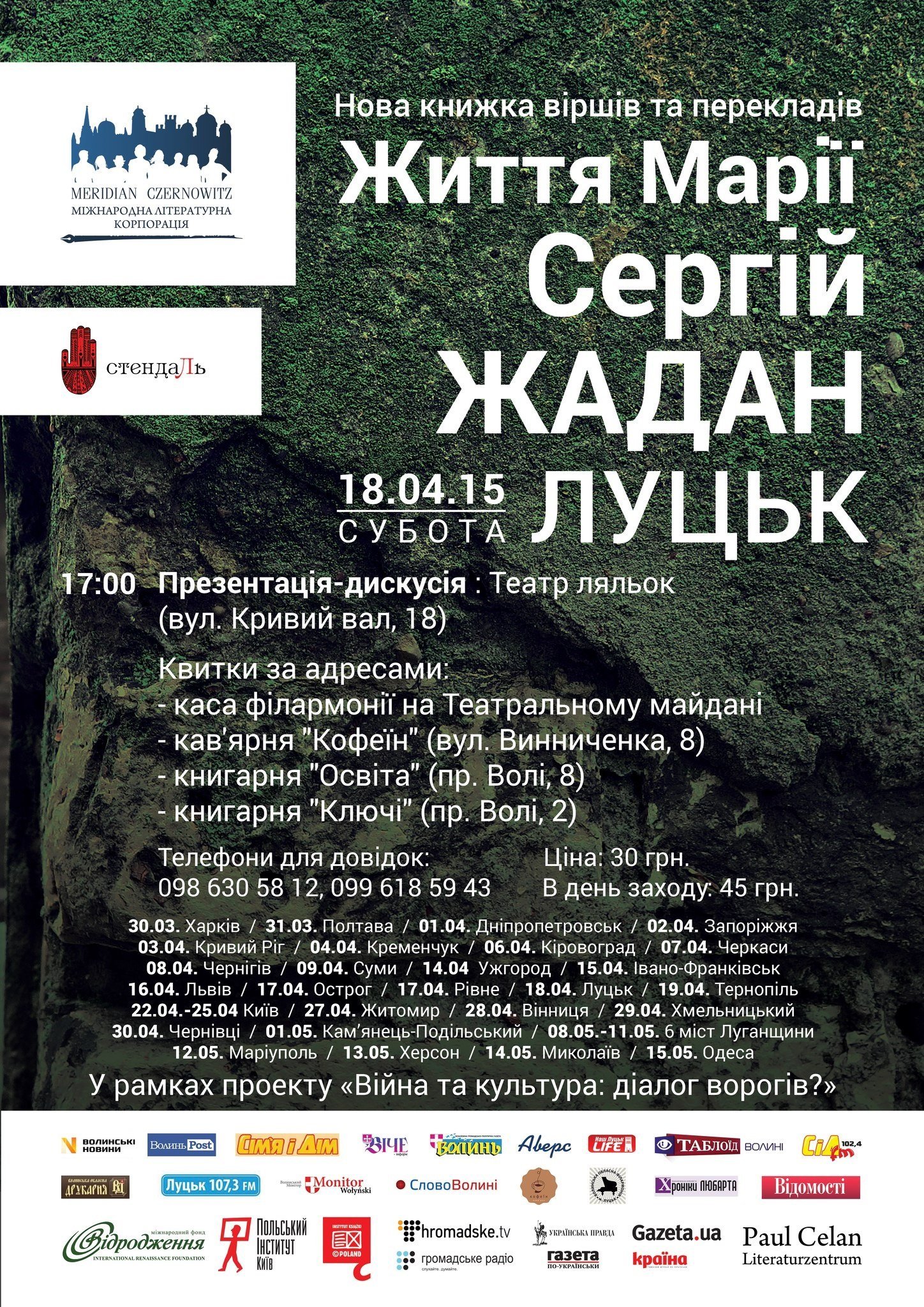 З 30 березня по 15 травня Міжнародна літературна корпорація MERIDIAN CZERNOWITZ організовує презентації нової книжки письменника і перекладача Сергія Жадана «Життя Марії», які відбудуться у 33 містах України. У Луцьку захід організовують мистецьке об’єднання «стендаЛь».