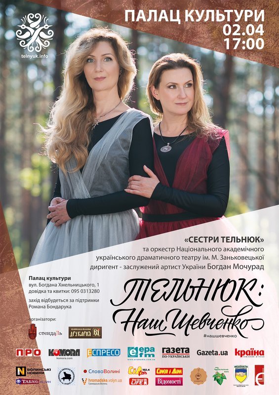 «ТЕЛЬНЮК: #нашшевченко» - це черговий музичний проект «Сестер Тельнюк», який представлять у Луцьку в супроводі оркестру Національного академічного українського драматичного театру ім. Марії Заньковецької (диригент – заслужений артист України Богдан Мочурад ), - повідомляють організатори заходу.