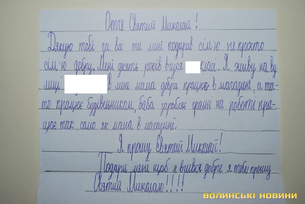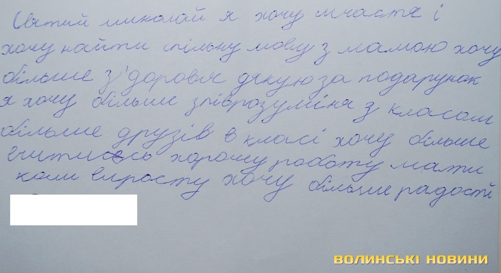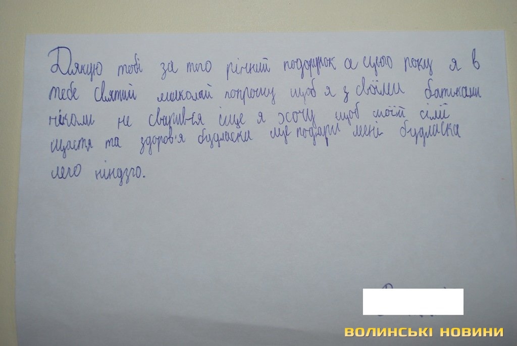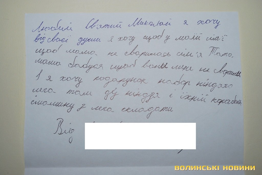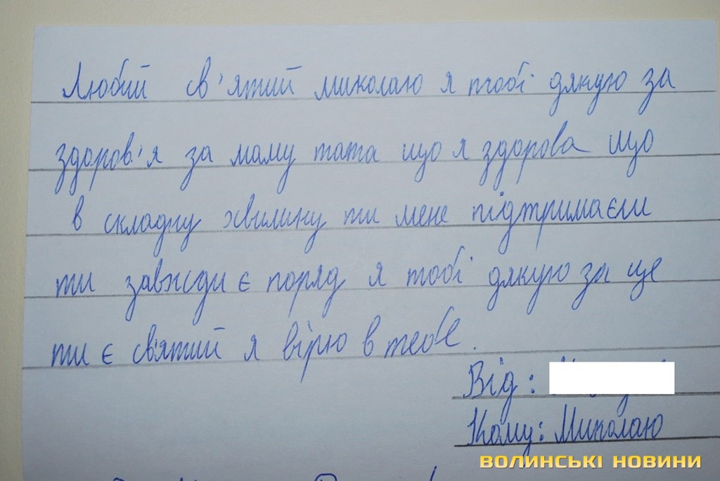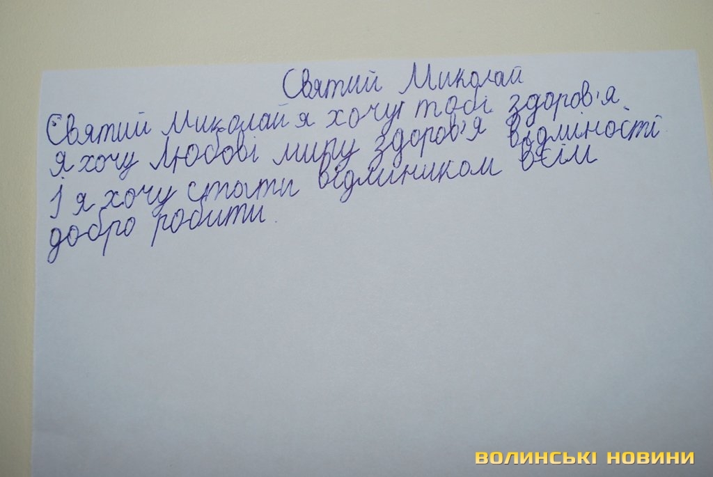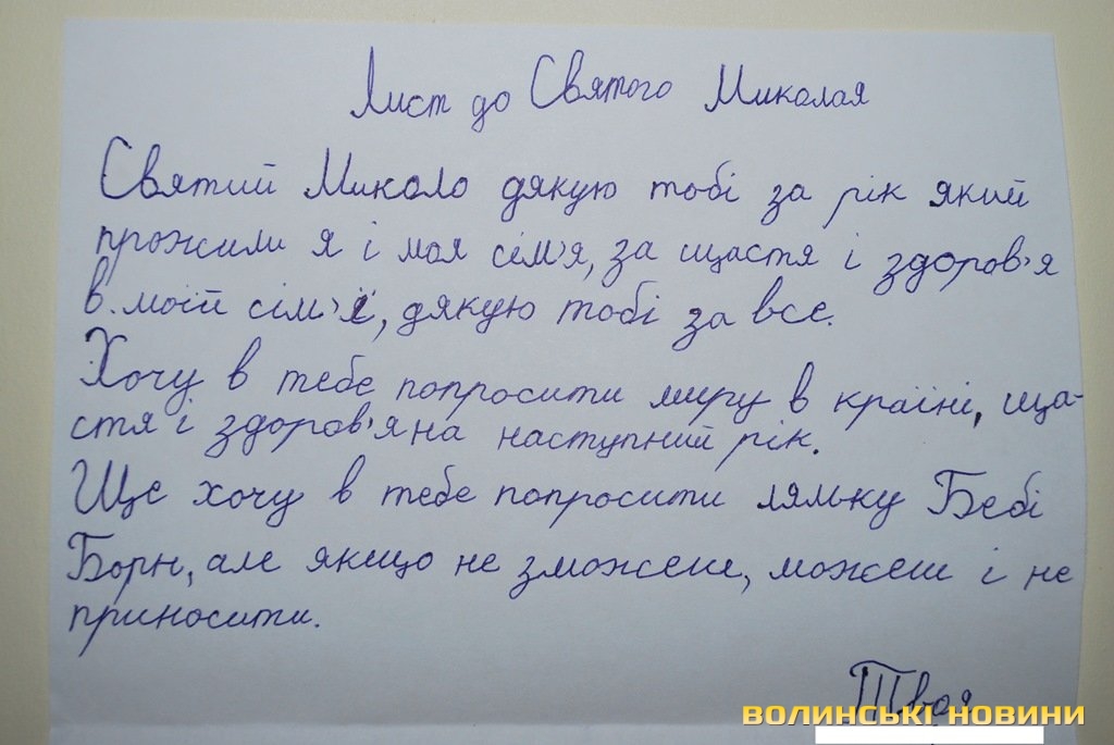 Отче Миколаю! Ще раз дякую за те, що в складну хвилину ти мене підтримуєш і є завжди поряд», - лист Миколаю від луцьких школярів.Лист 1: «Святий Миколаю, я вірю, що ти існуєш».