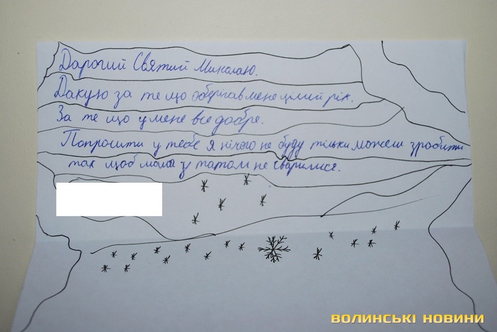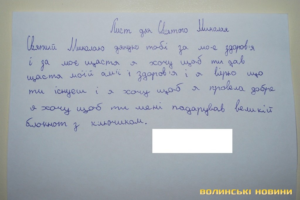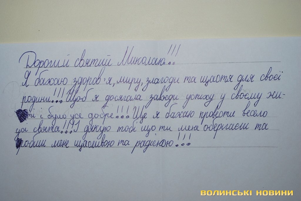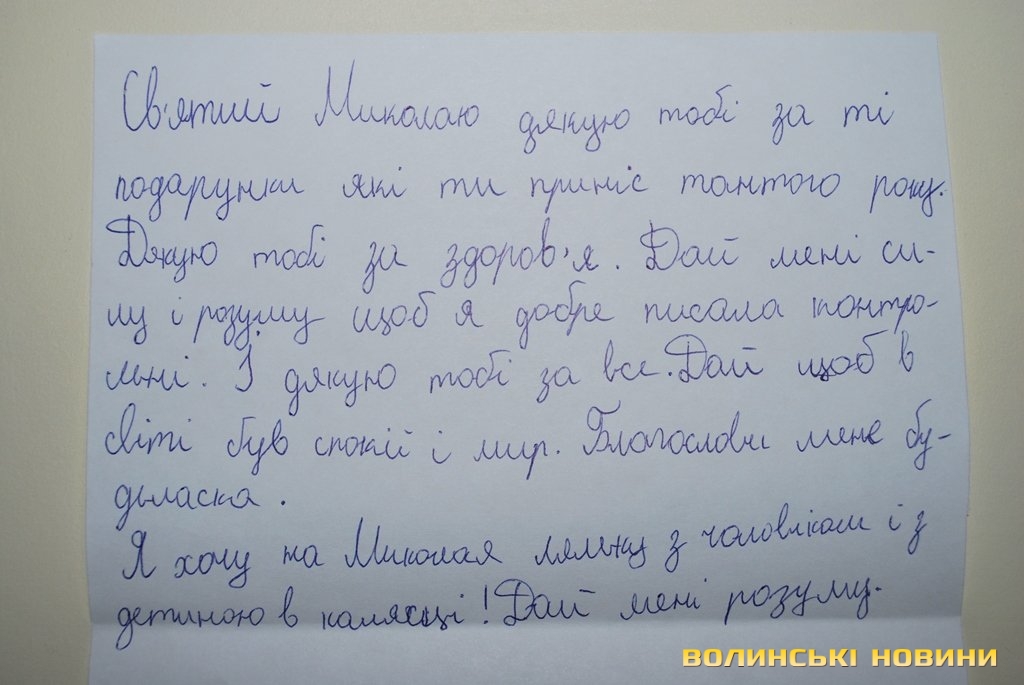 «Святий Миколаю! Я вірю, що ти існуєш, а тому пишу тобі цей лист, бо знаю, що ти мене чуєш. Перше, що я хочу сказати – це подякувати за те, що ти мене оберігаєш та робиш щасливою. Найбільше, що я зараз хочу, це те, аби в Україні був мир. Святий Миколаю, дай мені сили і розуму, адже хочу всім робити добро. Також прошу у тебе здоров’я, а ще - щоб ти дав мені терпіння. Якщо зможеш, то зроби, будь ласка, так, аби моя мама знайшла роботу, для нашої сім’ї це дуже важливо.