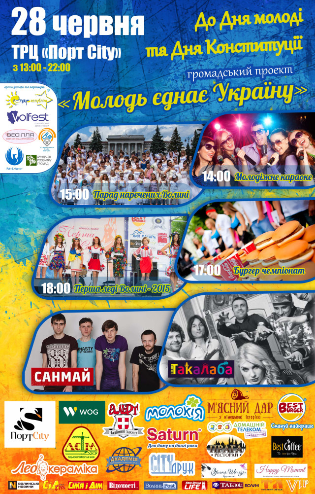 З нагоди Дня молоді та Дня Конституції України у Луцьку відбудеться громадський захід «Молодь єднає Україну». Початок свята запланували на 13:30 28 червня біля ТРЦ «Порт Сіті», – інформує керівник оргкомітету події Валерій Пельц.